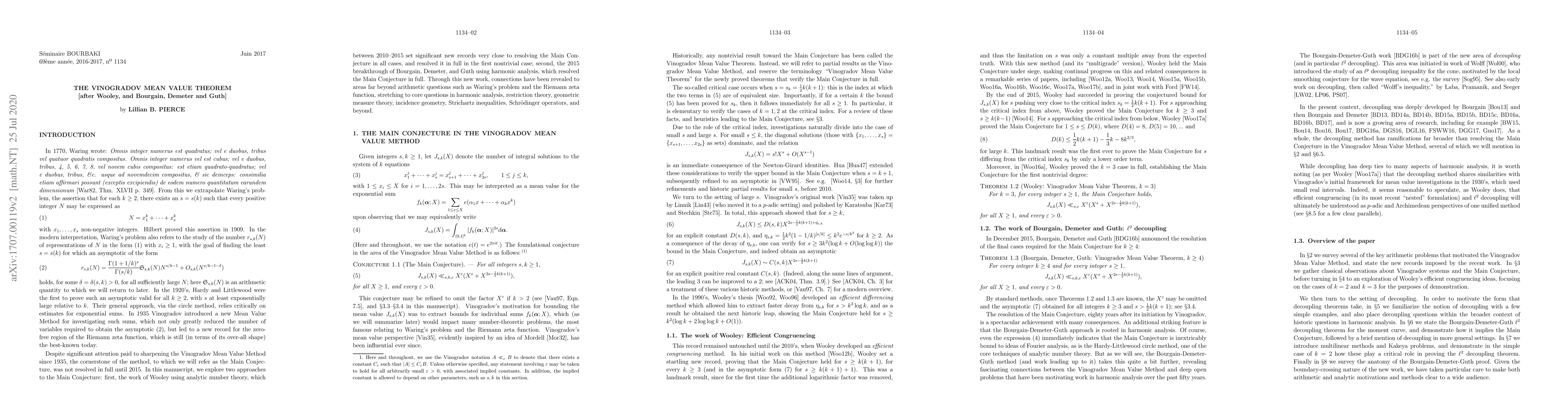 This is the expository essay that accompanies my Bourbaki Seminar on 17 June 2017 on the landmark proof of the Vinogradov Mean Value Theorem, and the two approaches developed in the work of Wooley and of Bourgain, Demeter and Guth.