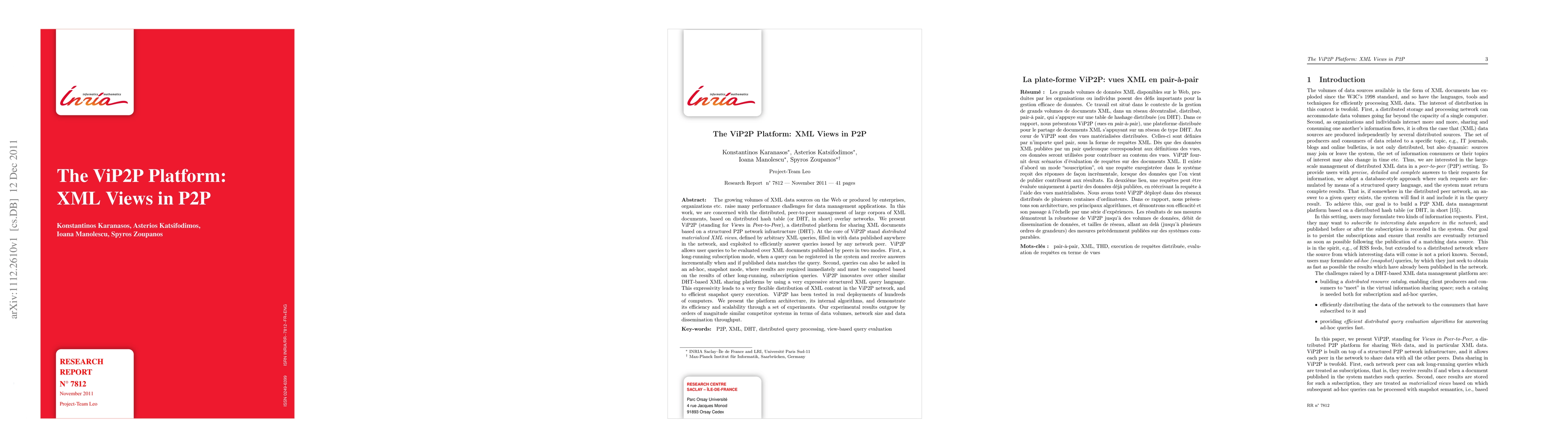 ViP2P is a distributed peer-to-peer platform for managing large XML document corpora using DHT networks, featuring materialized XML views and expressive query language for efficient query evaluation in subscription and ad-hoc modes. Experimental results show significant performance improvements over similar systems.