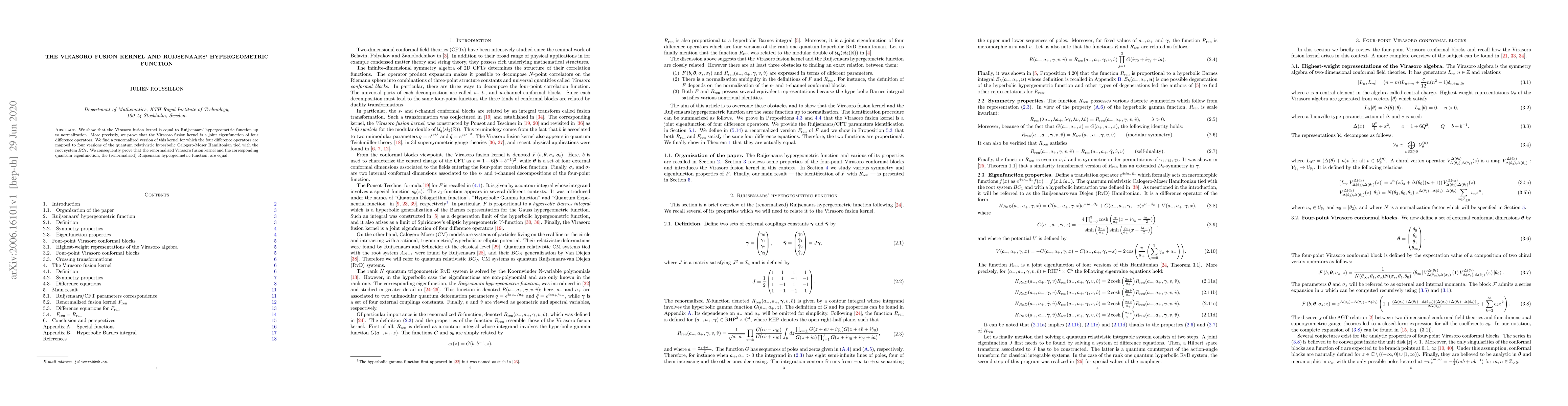 We show that the Virasoro fusion kernel is equal to Ruijsenaars' hypergeometric function up to normalization. More precisely, we prove that the Virasoro fusion kernel is a joint eigenfunction of four difference operators. We find a renormalized version of this kernel for which the four difference operators are mapped to four versions of the quantum relativistic hyperbolic Calogero-Moser Hamiltonian tied with the root system $BC_1$. We consequently prove that the renormalized Virasoro fusion kernel and the corresponding quantum eigenfunction, the (renormalized) Ruijsenaars hypergeometric function, are equal.