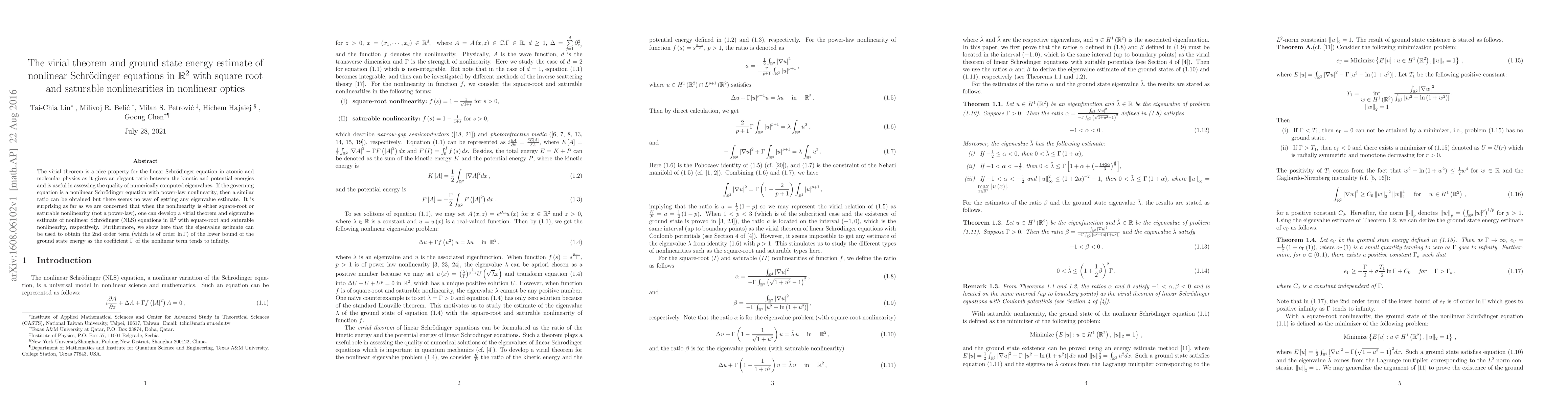 This paper develops a virial theorem for nonlinear Schrödinger equations in $\mathbb{R}^2$ with square-root and saturable nonlinearities, enabling eigenvalue estimates. It also provides a second-order term for the lower bound of the ground state energy as the nonlinearity coefficient tends to infinity.