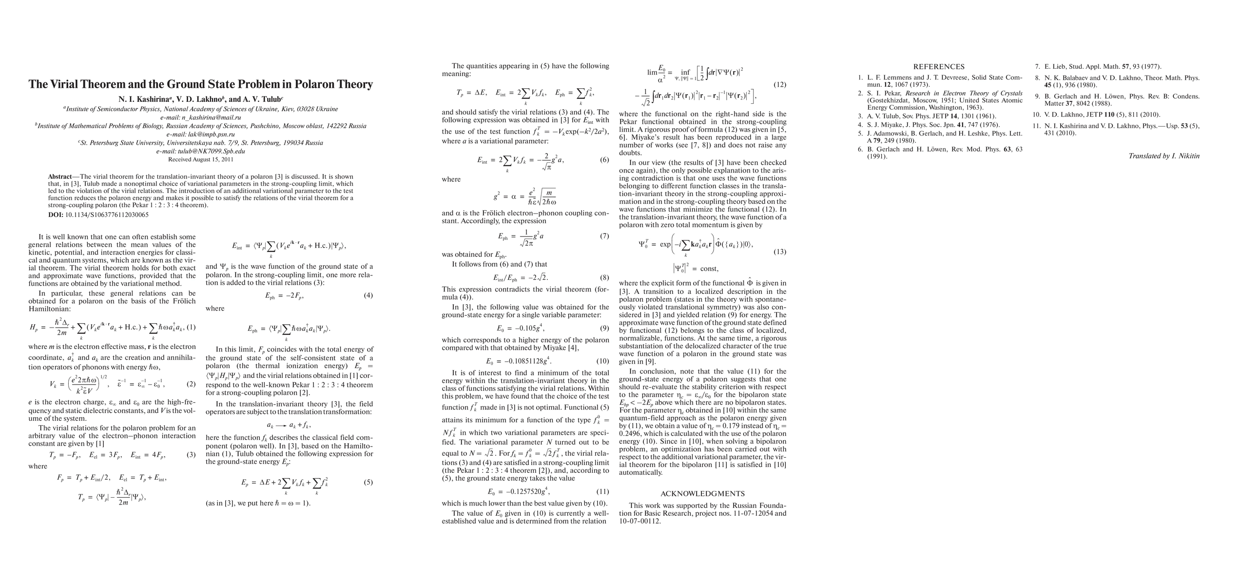 The research discusses the virial theorem for a translation-invariant polaron theory, identifying a nonoptimal choice of variational parameters in the strong-coupling limit by Tulub, which violated the virial relations. The paper introduces an additional variational parameter to the test function, reducing polaron energy and satisfying the virial theorem for a strong-coupling polaron (Pekar 1 : 2 : 3 : 4 theorem).