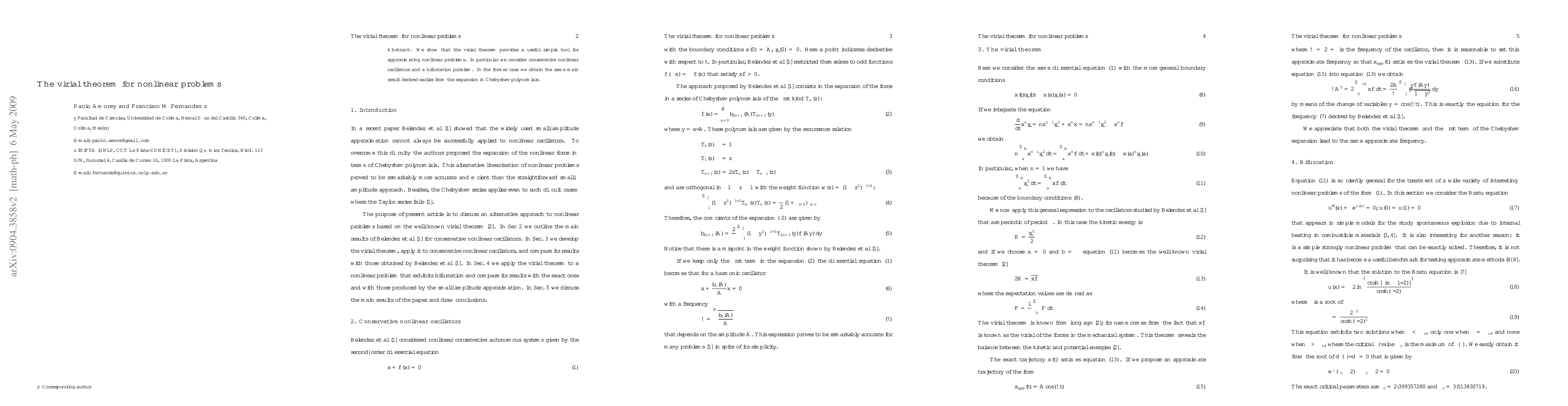 Summary: The paper demonstrates the applicability of the virial theorem for approximating solutions to nonlinear problems, specifically conservative nonlinear oscillators and bifurcation issues, yielding results comparable to those derived from Chebyshev polynomial expansions.
