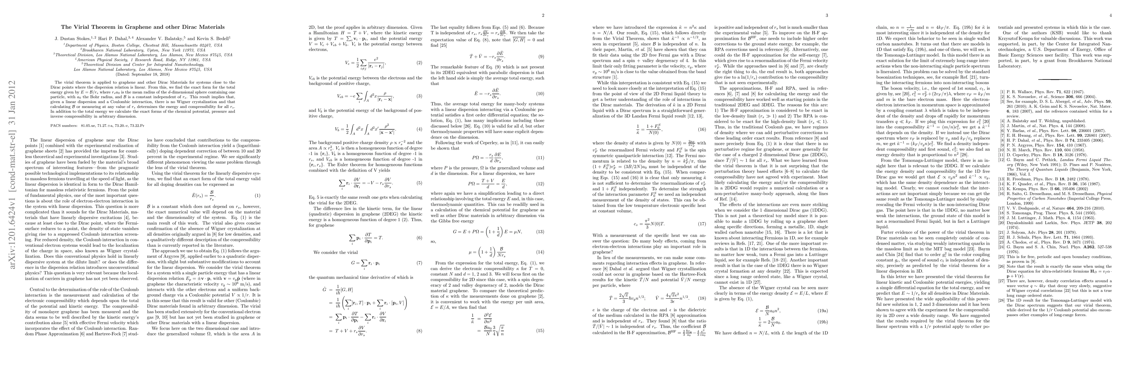 The virial theorem is applied to graphene and other Dirac Materials for systems close to the Dirac points where the dispersion relation is linear. From this, we find the exact form for the total energy given by $E = \mathcal{B}/r_s$ where $r_s a_0$ is the mean radius of the $d$-dimensional sphere containing one particle, with $a_0$ the Bohr radius, and $\mathcal{B}$ is a constant independent of $r_s$. This result implies that, given a linear dispersion and a Coulombic interaction, there is no Wigner crystalization and that calculating $\mathcal{B}$ or measuring at any value of $r_s$ determines the energy and compressibility for all $r_s$. In addition to the total energy we calculate the exact forms of the chemical potential, pressure and inverse compressibility in arbitrary dimension.
