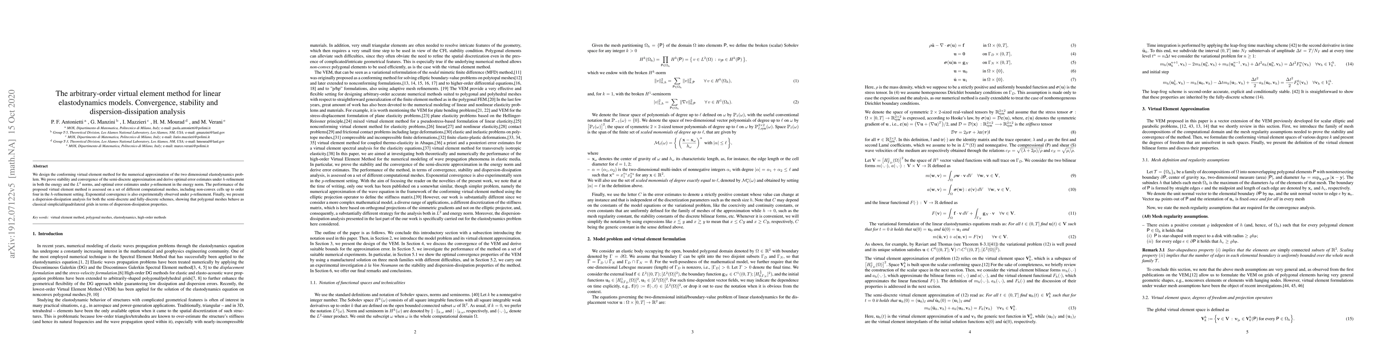 The paper proposes a conforming virtual element method for solving two-dimensional linear elastodynamics problems, proving its stability, convergence, and optimal error estimates under $h$- and $p$-refinement. Experimental results show exponential convergence under $p$-refinement and similar dispersion-dissipation properties as classical grids.