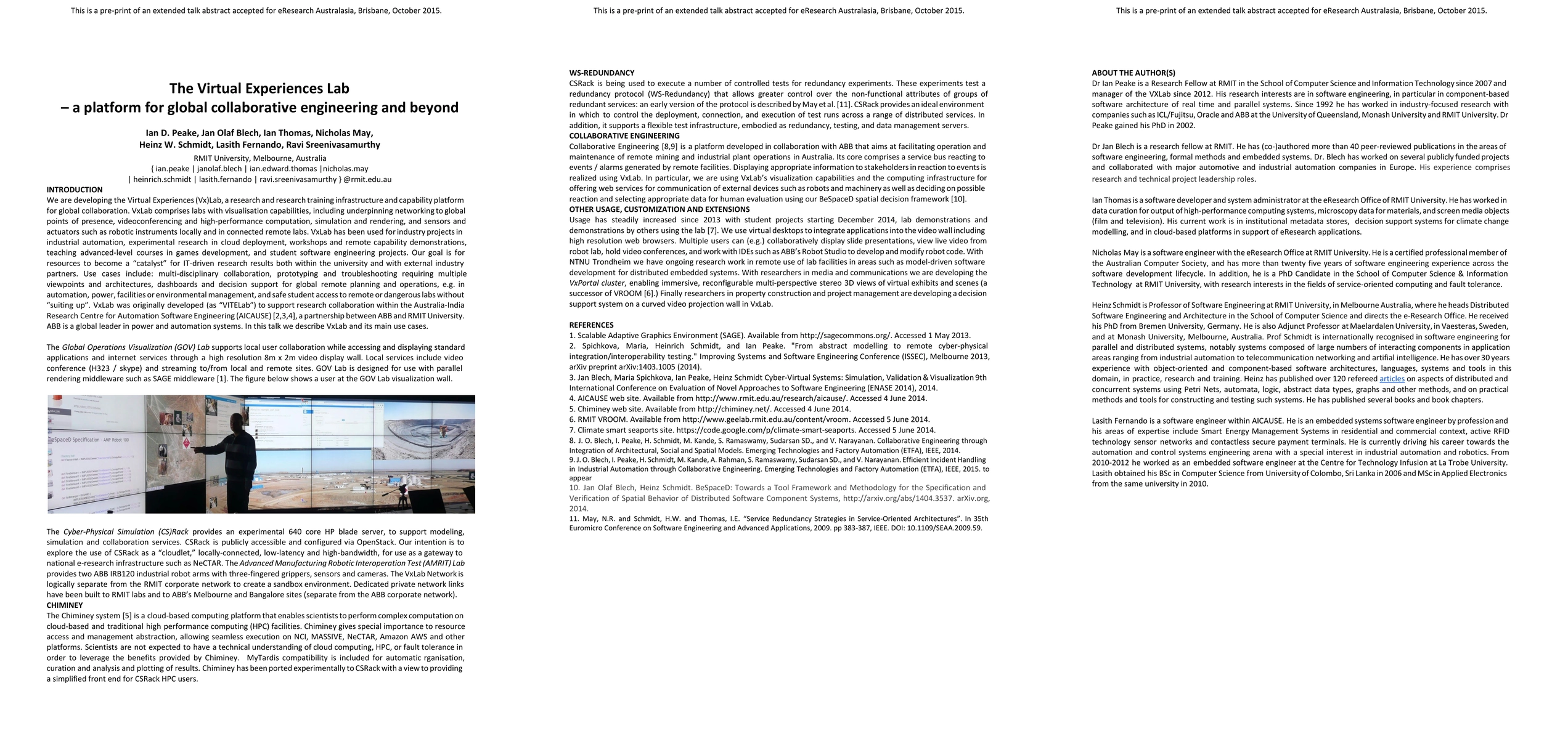 The Virtual Experiences (Vx)Lab is a global collaborative platform for engineering and beyond, featuring visualization labs, networking, videoconferencing, and high-performance computing to facilitate industry projects, research, and advanced education. Its aim is to act as a catalyst for IT-driven research outcomes through multi-disciplinary collaboration and remote operations.