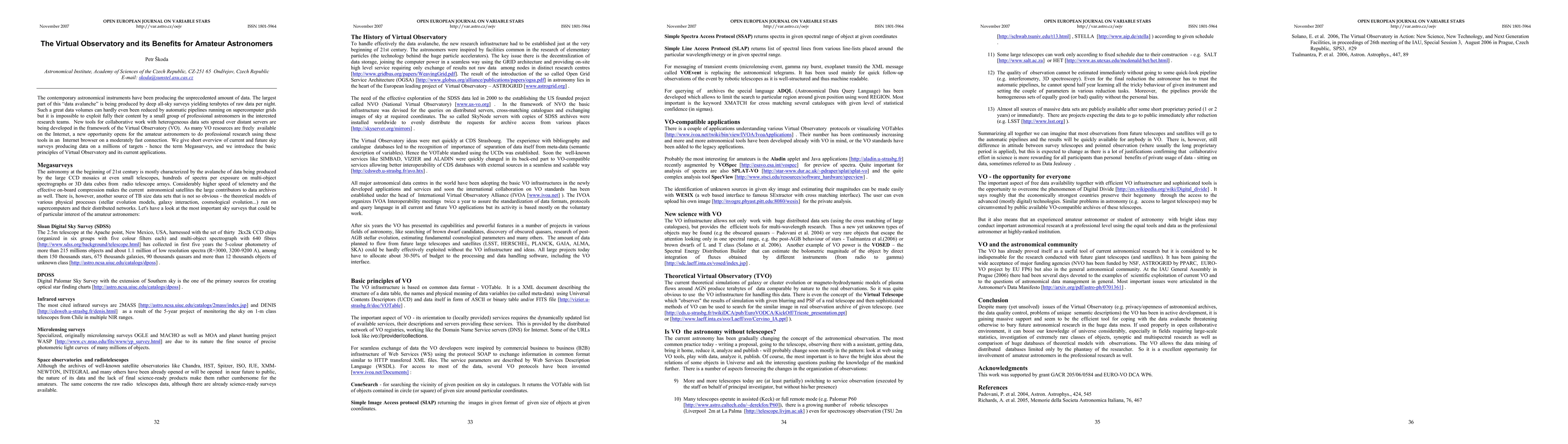 The Virtual Observatory (VO) provides tools for collaborative data analysis, enabling amateur astronomers to access vast amounts of data from professional surveys via the Internet. This democratization of data allows non-professionals to conduct research using VO's freely available resources.