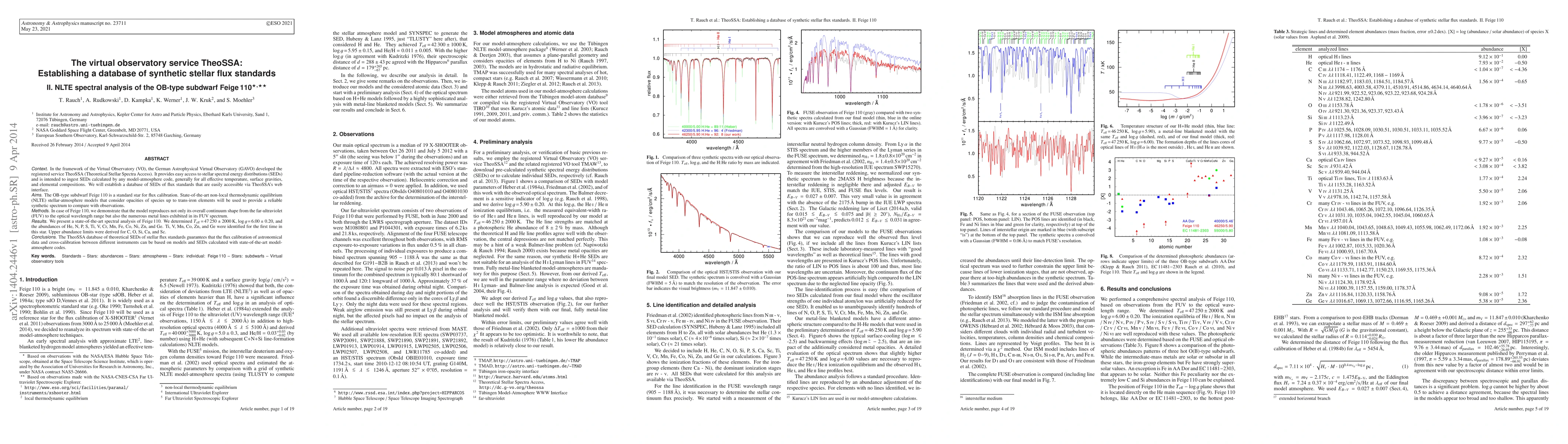 In the framework of the Virtual Observatory (VO), the German Astrophysical Virtual Observatory (GAVO) developed the registered service TheoSSA (Theoretical Stellar Spectra Access). It provides easy access to stellar spectral energy distributions (SEDs) and is intended to ingest SEDs calculated by any model-atmosphere code, generally for all effective temperature, surface gravities, and elemental compositions. We will establish a database of SEDs of flux standards that are easily accessible via TheoSSA's web interface. The OB-type subdwarf Feige 110 is a standard star for flux calibration. State-of-the-art non-local thermodynamic equilibrium (NLTE) stellar-atmosphere models that consider opacities of species up to trans-iron elements will be used to provide a reliable synthetic spectrum to compare with observations. In case of Feige 110, we demonstrate that the model reproduces not only its overall continuum shape from the far-ultraviolet (FUV) to the optical wavelength range but also the numerous metal lines exhibited in its FUV spectrum. We present a state-of-the-art spectral analysis of Feige 110. We determined $T_\mathrm{eff} = 47\,250 \pm 2000\,\mathrm{K}$, $\log g = 6.00 \pm 0.20$ and the abundances of He, N, P, S, Ti, V, Cr, Mn, Fe, Co, Ni, Zn, and Ge. Ti, V, Mn, Co, Zn, and Ge were identified for the first time in this star. Upper abundance limits were derived for C, O, Si, Ca, and Sc. The TheoSSA database of theoretical SEDs of stellar flux standards guarantees that the flux calibration of astronomical data and cross-calibration between different instruments can be based on models and SEDs calculated with state-of-the-art model-atmosphere codes.