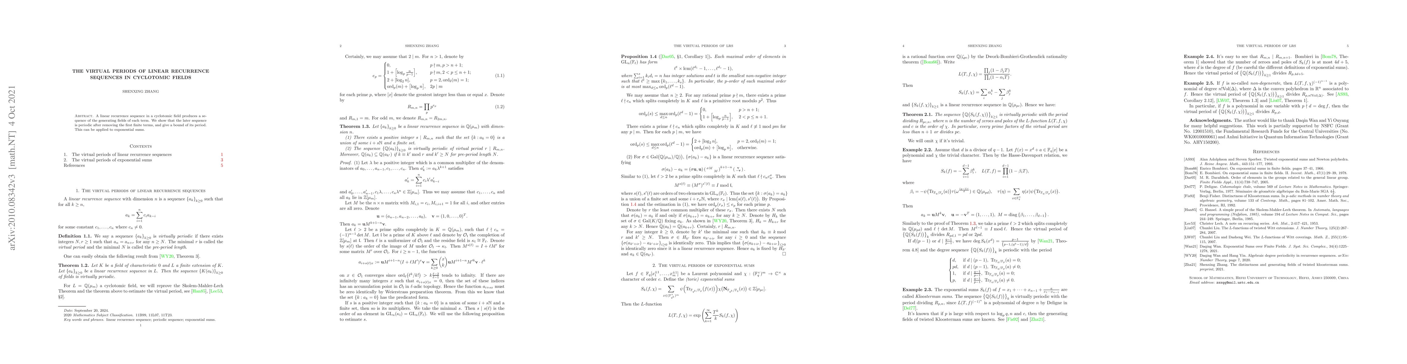 A linear recurrence sequence in a cyclotomic field produces a sequence of the generating fields of each term. We show that the later sequence is periodic after removing the first finite terms, and give a bound of its period. This can be applied to exponential sums.