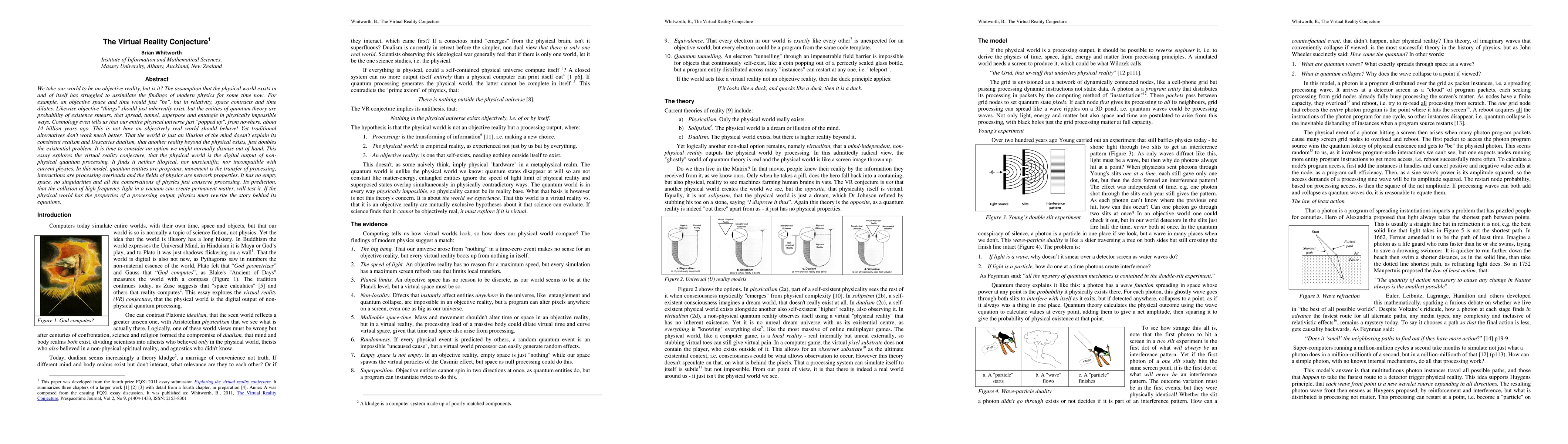 This paper proposes a virtual reality conjecture that suggests the physical world is the digital output of non-physical quantum processing, where quantum entities are programs and interactions are processing overloads.
