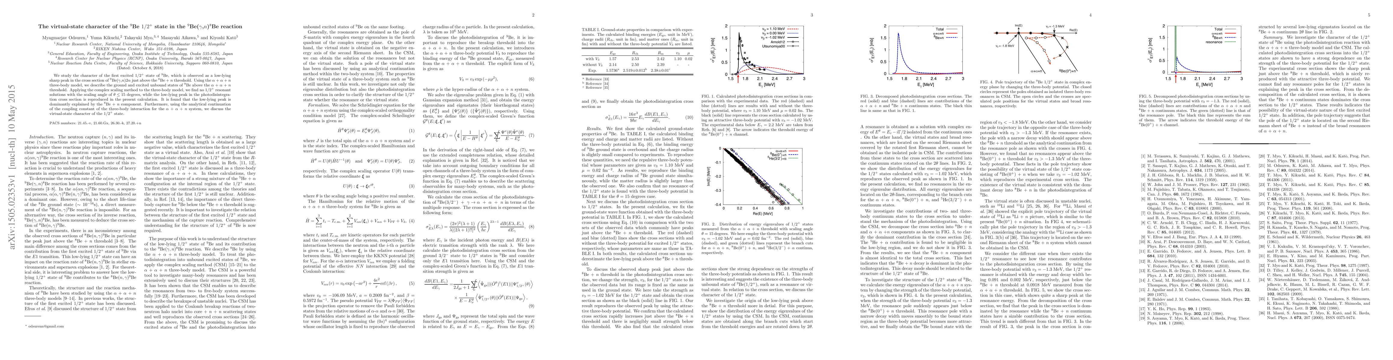 We study the character of the first excited 1/2^{+} state of {9}^Be, which is observed as a low-lying sharp peak in the cross section of 9^Be({\gamma},n)2{\alpha} just above the {8}^Be+n threshold. Using the {\alpha}+{\alpha}+n three-body model, we describe the ground and excited unbound states of {9}^Be above the {\alpha}+{\alpha}+n threshold. Applying the complex scaling method to the three-body model, we find no 1/2^{+} resonant solutions, while the low-lying peak in the photodisintegration cross section is reproduced in the present calculation. It is found that the low-lying peak is dominantly explained by the 8^Be+n component. Furthermore, using the analytical continuation of the coupling constant of the three-body interaction for the {\alpha}+{\alpha}+n system, we discuss the virtual-state character of the 1/2^{+} state.