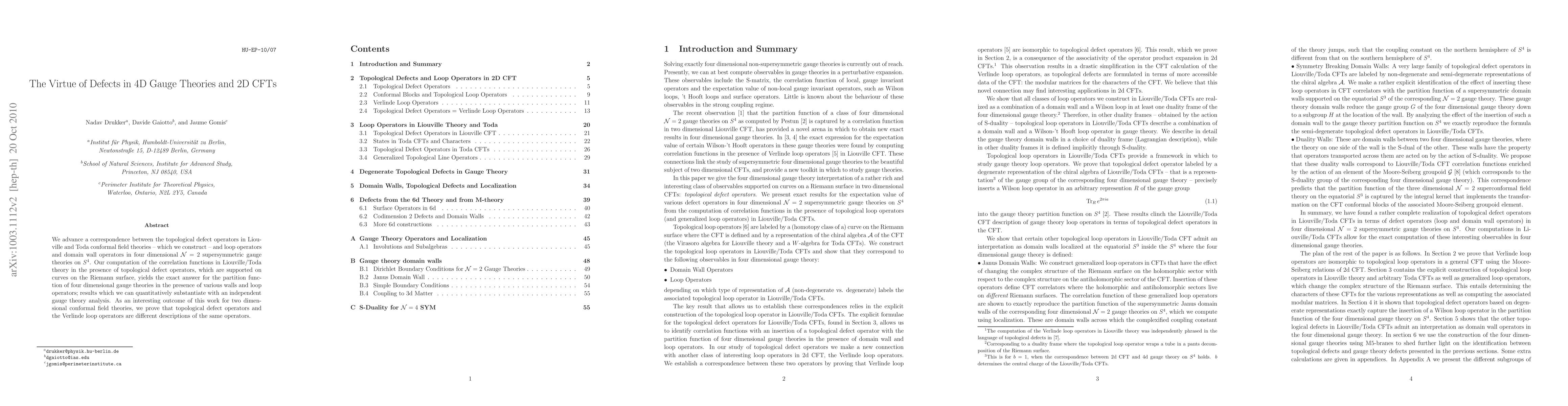 We advance a correspondence between the topological defect operators in Liouville and Toda conformal field theories - which we construct - and loop operators and domain wall operators in four dimensional N=2 supersymmetric gauge theories on S^4. Our computation of the correlation functions in Liouville/Toda theory in the presence of topological defect operators, which are supported on curves on the Riemann surface, yields the exact answer for the partition function of four dimensional gauge theories in the presence of various walls and loop operators; results which we can quantitatively substantiate with an independent gauge theory analysis. As an interesting outcome of this work for two dimensional conformal field theories, we prove that topological defect operators and the Verlinde loop operators are different descriptions of the same operators.
