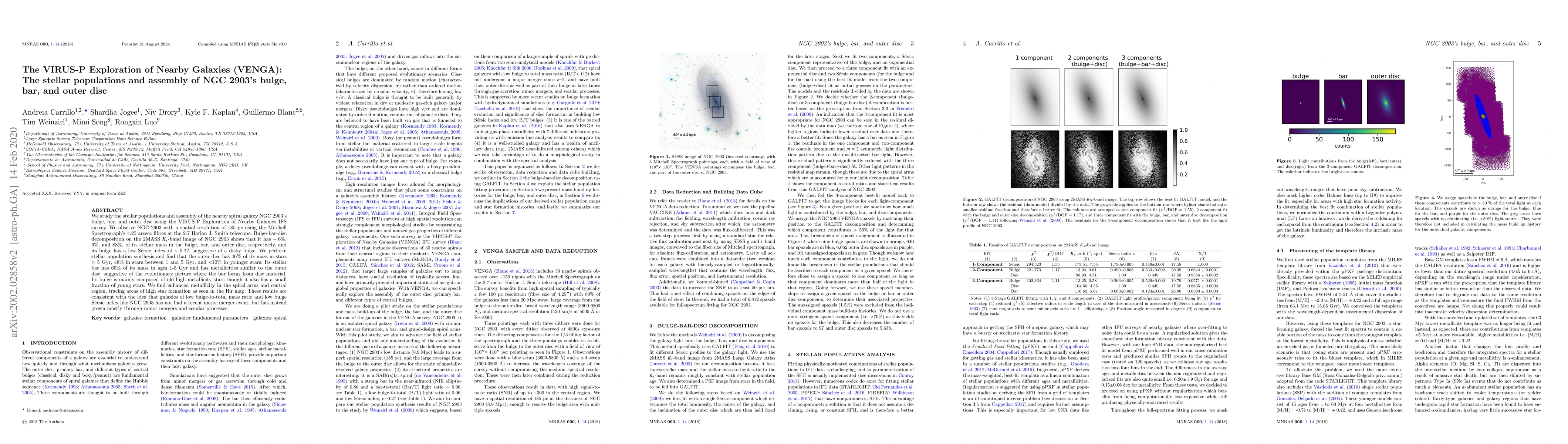 This study investigates NGC 2903's bulge, bar, and outer disc using VIRUS-P IFS survey data, finding a disky bulge with old high-metallicity stars and enhanced metallicity in spiral arms. The results support the idea that galaxies like NGC 2903 have grown mostly through minor mergers and secular processes without recent major merger events.