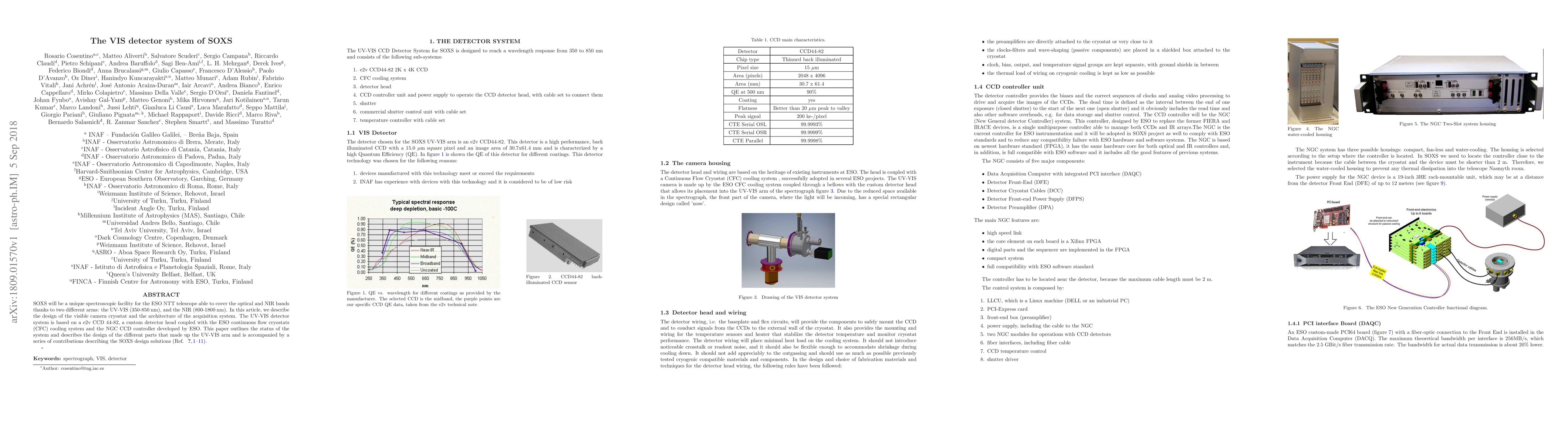 SOXS will be a unique spectroscopic facility for the ESO NTT telescope able to cover the optical and NIR bands thanks to two different arms: the UV-VIS (350-850 nm), and the NIR (800-1800 nm). In this article, we describe the design of the visible camera cryostat and the architecture of the acquisition system. The UV-VIS detector system is based on a e2v CCD 44-82, a custom detector head coupled with the ESO continuous ow cryostats (CFC) cooling system and the NGC CCD controller developed by ESO. This paper outlines the status of the system and describes the design of the different parts that made up the UV-VIS arm and is accompanied by a series of contributions describing the SOXS design solutions.