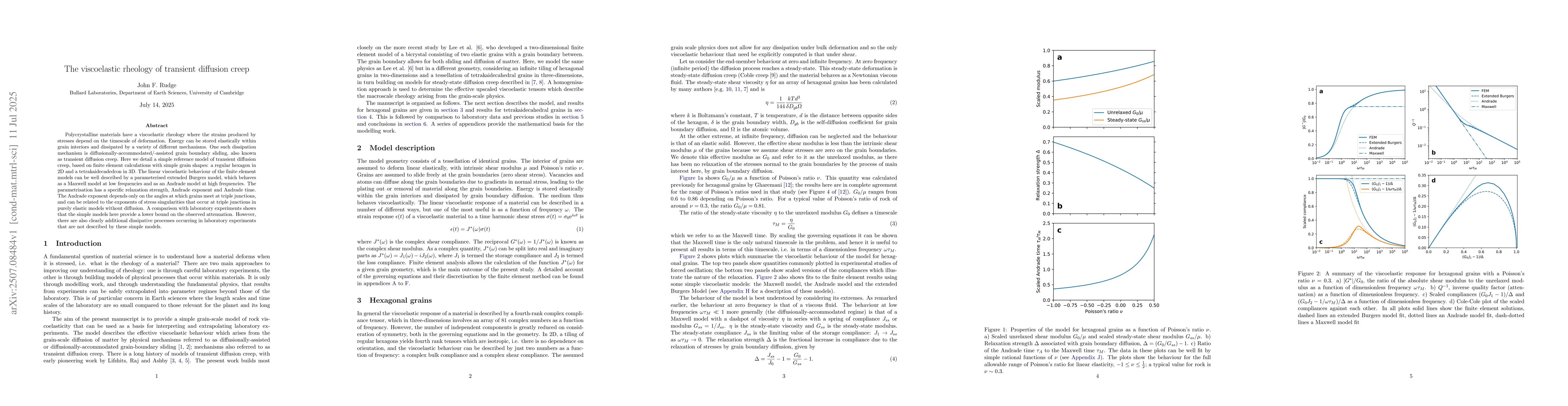 Polycrystalline materials have a viscoelastic rheology where the strains produced by stresses depend on the timescale of deformation. Energy can be stored elastically within grain interiors and dissipated by a variety of different mechanisms. One such dissipation mechanism is diffusionally-accommodated/-assisted grain boundary sliding, also known as transient diffusion creep. Here we detail a simple reference model of transient diffusion creep, based on finite element calculations with simple grain shapes: a regular hexagon in 2D and a tetrakaidecadedron in 3D. The linear viscoelastic behaviour of the finite element models can be well described by a parameterised extended Burgers model, which behaves as a Maxwell model at low frequencies and as an Andrade model at high frequencies. The parametrisation has a specific relaxation strength, Andrade exponent and Andrade time. The Andrade exponent depends only on the angles at which grains meet at triple junctions, and can be related to the exponents of stress singularities that occur at triple junctions in purely elastic models without diffusion. A comparison with laboratory experiments shows that the simple models here provide a lower bound on the observed attenuation. However, there are also clearly additional dissipative processes occurring in laboratory experiments that are not described by these simple models.