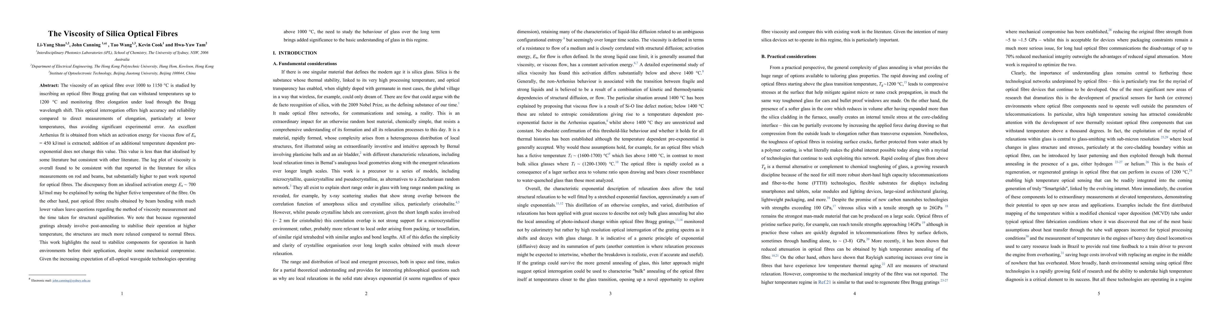 The viscosity of an optical fibre over 1000 to 1150 {\deg}C is studied by inscribing an optical fibre Bragg grating that can withstand temperatures up to 1200 {\deg}C and monitoring fibre elongation under load through the Bragg wavelength shift. This optical interrogation offers high accuracy and reliability compared to direct measurements of elongation, particularly at lower temperatures, thus avoiding significant experimental error. An excellent Arrhenius fit is obtained from which an activation energy for viscous flow of Ea = 450 kJ/mol is extracted; addition of an additional temperature dependent pre-exponential does not change this value. This value is less than that idealised by some literature but consistent with other literature. The log plot of viscosity is overall found to be consistent with that reported in the literature for silica measurements on rod and beams, but substantially higher to past work reported for optical fibres. The discrepancy from an idealised activation energy Ea ~ 700 kJ/mol may be explained by noting the higher fictive temperature of the fibre. On the other hand, past optical fibre results obtained by beam bending with much lower values leave questions regarding the method of viscosity measurement and the time taken for structural equilibration. We note that because regenerated gratings already involve post-annealing to stabilise their operation at higher temperature, the structures are much more relaxed compared to normal fibres. This work highlights the need to stabilize components for operation in harsh environments before their application, despite some mechanical compromise. Given the increasing expectation of all-optical waveguide technologies operating above 1000 {\deg}C, the need to study the behaviour of glass over the long term brings added significance to the basic understanding of glass in this regime.