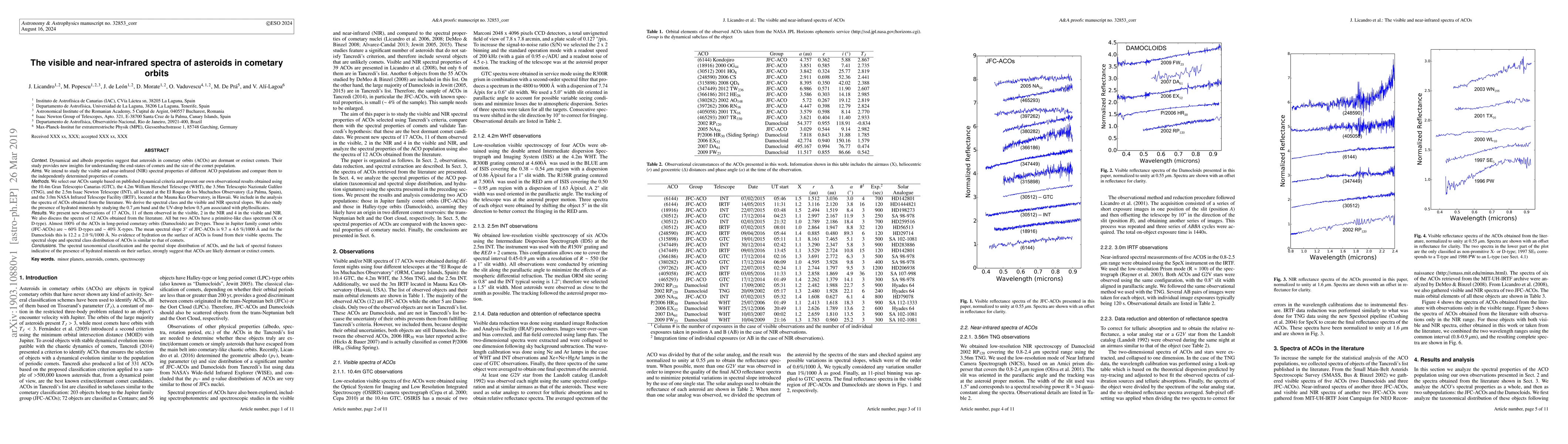 The research analyzed the visible and near-infrared (NIR) spectral properties of asteroids in cometary orbits (ACOs) using observations from various telescopes, including the 10.4m Gran Telescopio Canarias (GTC), 4.2m William Herschel Telescope (WHT), 3.56m Telescopio Nazionale Galileo (TNG), 2.5m Isaac Newton Telescope (INT), and the 3m NASA Infrared Telescope Facility (IRTF). The study also incorporated previously published spectra from the literature.