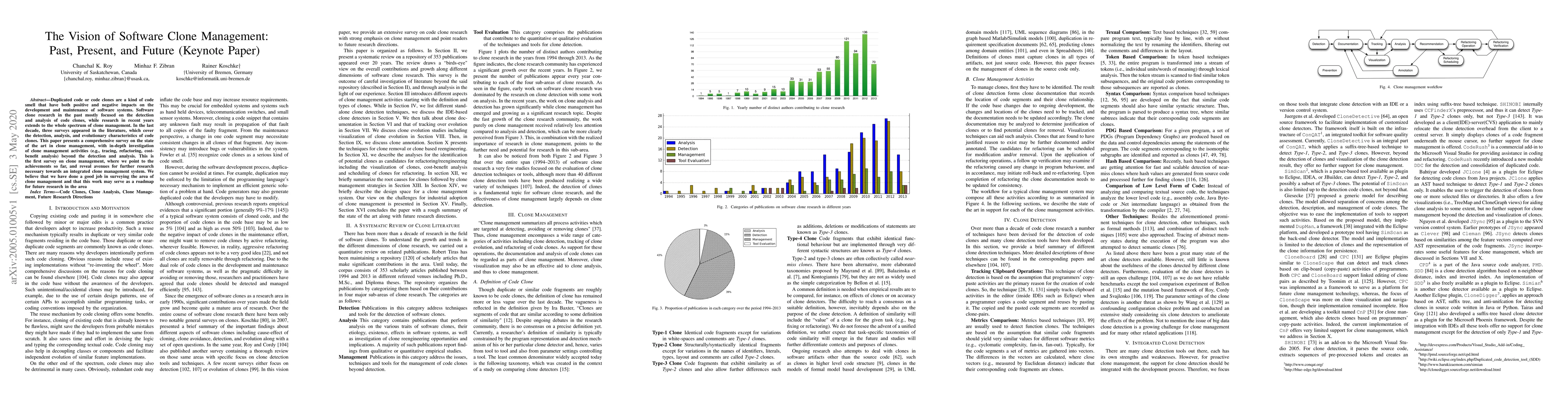 This paper is a comprehensive survey on software clone management, which goes beyond just detection and analysis. It explores activities like tracing, refactoring, and cost-benefit analysis of code clones, providing a roadmap for future research in the area.