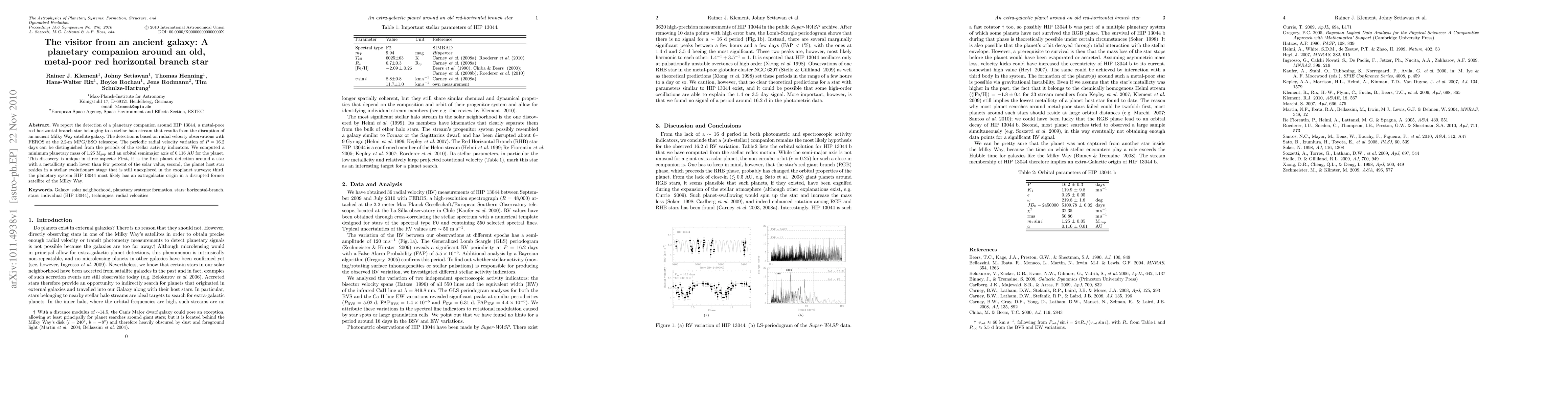 This paper reports the first detection of a planet around HIP 13044, a metal-poor red horizontal branch star, using radial velocity observations. The planet, with a minimum mass of 1.25 Jupiter masses, orbits at 0.116 AU with a period of 16.2 days.