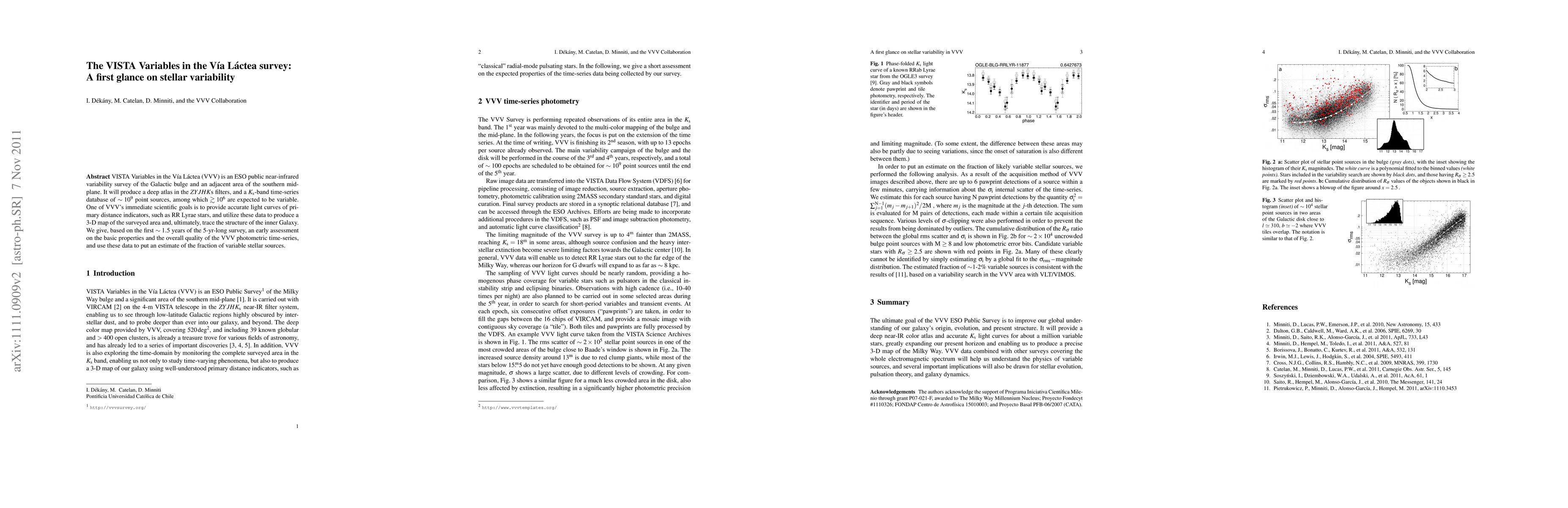 VISTA Variables in the Via Lactea (VVV) is an ESO public near-infrared variability survey of the Galactic bulge and an adjacent area of the southern mid-plane. It will produce a deep atlas in the ZYJHKs filters, and a Ks-band time-series database of ~10^9 point sources, among which >~10^6 are expected to be variable. One of VVV's immediate scientific goals is to provide accurate light curves of primary distance indicators, such as RR Lyrae stars, and utilize these data to produce a 3-D map of the surveyed area and, ultimately, trace the structure of the inner Galaxy. We give, based on the first ~1.5 years of the 5-yr-long survey, an early assessment on the basic properties and the overall quality of the VVV photometric time-series, and use these data to put an estimate of the fraction of variable stellar sources.