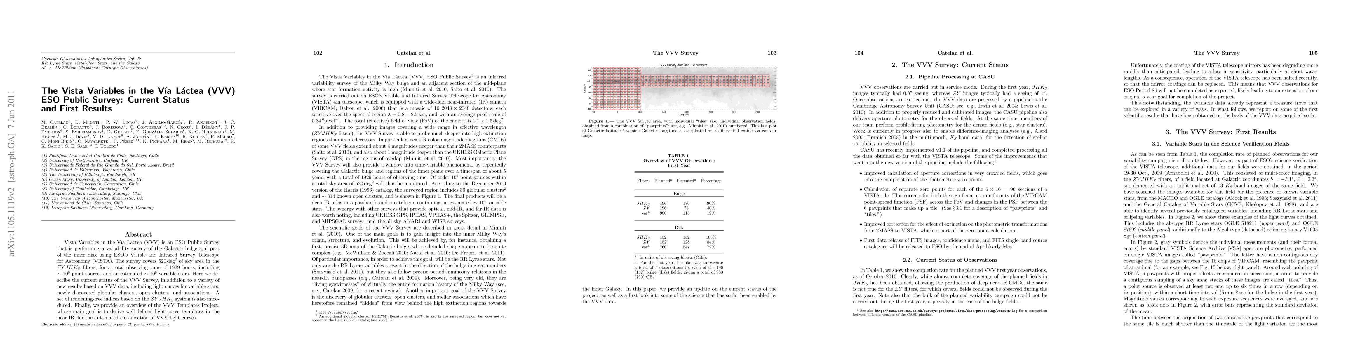 The VVV survey is mapping variable stars in the Galactic bulge and inner disk using VISTA, revealing ~10^6 variable stars and new clusters. Initial results include light curves, newly discovered clusters, and reddening-free indices, alongside the VVV Templates Project for automated light curve classification.