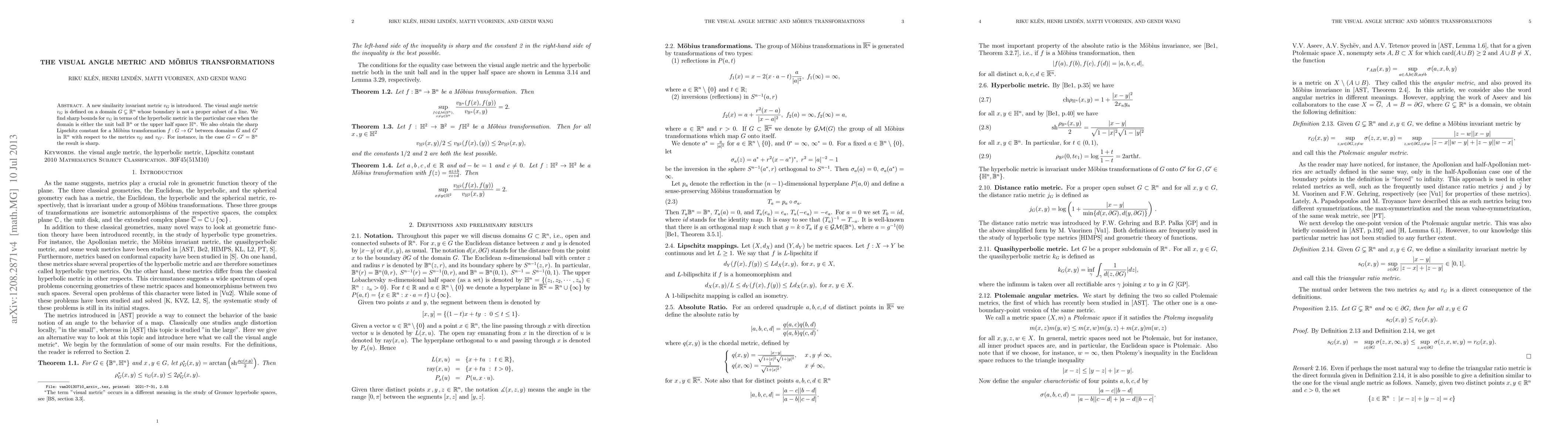 A new similarity invariant metric $v_G$ is introduced. The visual angle metric $v_G$ is defined on a domain $G\subsetneq\Rn$ whose boundary is not a proper subset of a line. We find sharp bounds for $v_G$ in terms of the hyperbolic metric in the particular case when the domain is either the unit ball $\Bn$ or the upper half space $\Hn$. We also obtain the sharp Lipschitz constant for a M\"obius transformation $f: G\rightarrow G'$ between domains $G$ and $G'$ in $\Rn$ with respect to the metrics $v_G$ and $v_{G'}$. For instance, in the case $G=G'=\Bn$ the result is sharp.