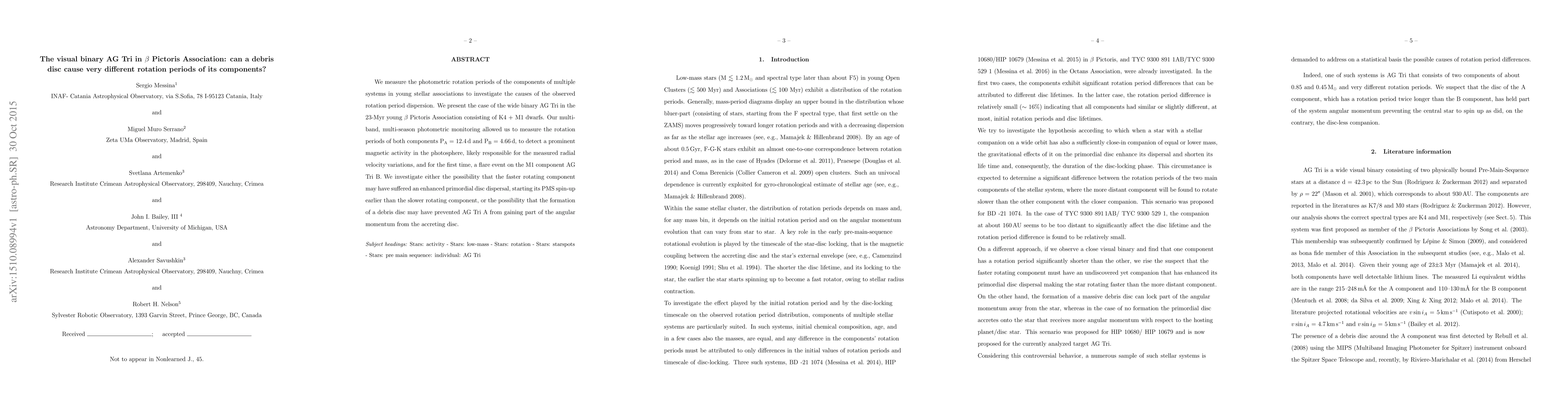 This paper investigates the rotation periods of the binary system AG Tri in the beta Pictoris Association, revealing significant differences between the components' rotation periods. It explores whether a debris disc may have caused these differences, suggesting that the faster rotating component may have experienced earlier spin-up or that the slower rotating component may have been hindered by a debris disc.