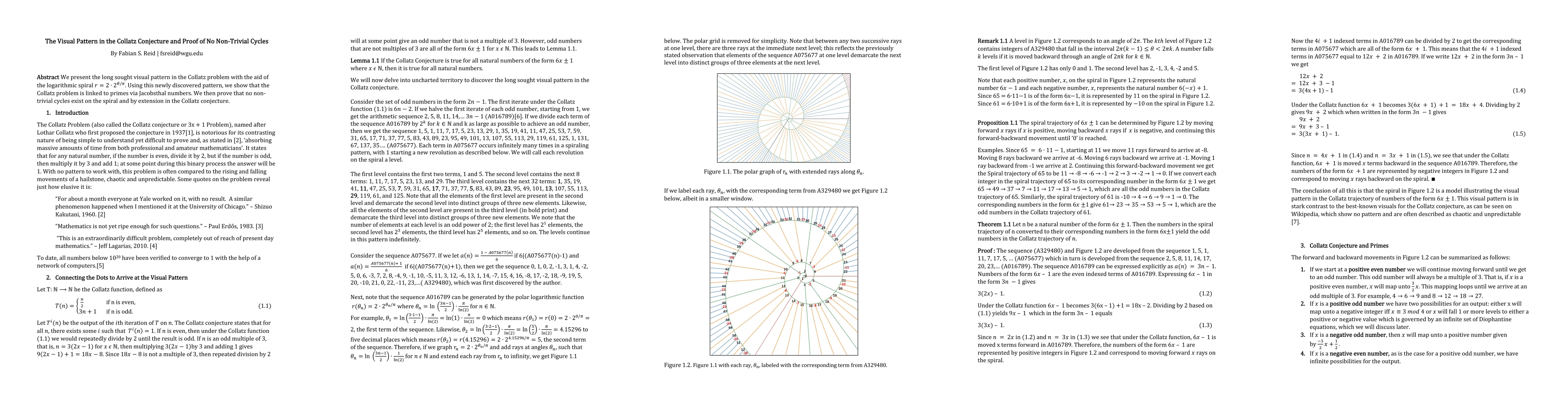 We present the long sought visual pattern in the Collatz problem with the aid of a logarithmic spiral. Using this newly discovered pattern, we show that the Collatz problem is linked to primes via Jacobsthal numbers. We then prove that no non-trivial cycles exist on the spiral and by extension in the Collatz problem.