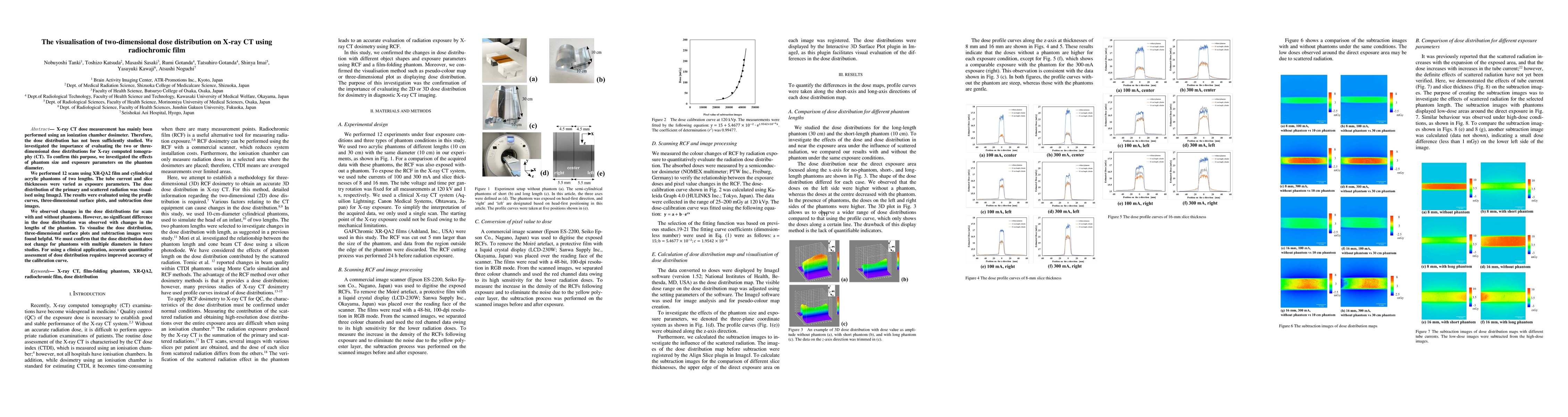 X-ray CT dose measurement has mainly been performed using an ionization chamber dosimeter. Therefore, the dose distribution has not been sufficiently studied. We investigated the importance of evaluating the two or three-dimensional dose distributions for X-ray computed tomography (CT). To confirm this purpose, we investigated the effects of phantom size and exposure parameters on the phantom diameter. We performed 12 scans using XR-QA2 film and cylindrical acrylic phantoms of two lengths. The tube current and slice thicknesses were varied as exposure parameters. The dose distribution of the primary and scattered radiation was visu-alised using ImageJ. The results were evaluated using the profile curves, three-dimensional surface plots, and subtrac-tion dose images. We observed changes in the dose distributions for scans with and without phantoms. However, no significant differ-ence in the dose distribution was observed with changes in the lengths of the phantom. To visualise the dose distribution, three-dimensional surface plots and subtraction images were found helpful. We must confirm that the dose distribution does not change for phantoms with multiple diameters in future studies. For using a clinical application, accurate quantitative assessment of dose distribution requires improved accuracy of the calibration curve.