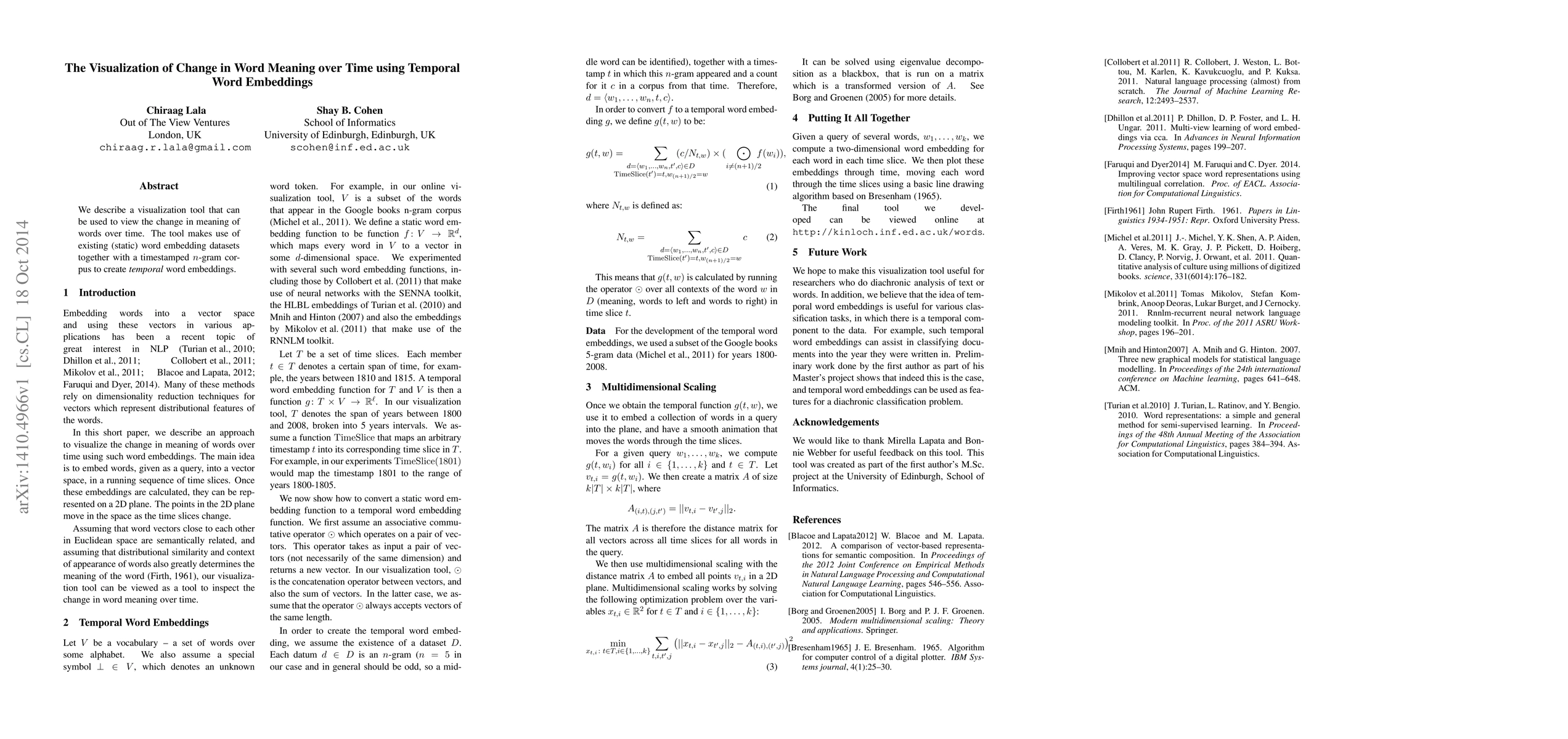 Summary: This paper presents a visualization tool for tracking word meaning changes over time using temporal word embeddings, combining static word embedding datasets with a timestamped $n$-gram corpus. The tool enables the dynamic observation of semantic shifts in word usage.
