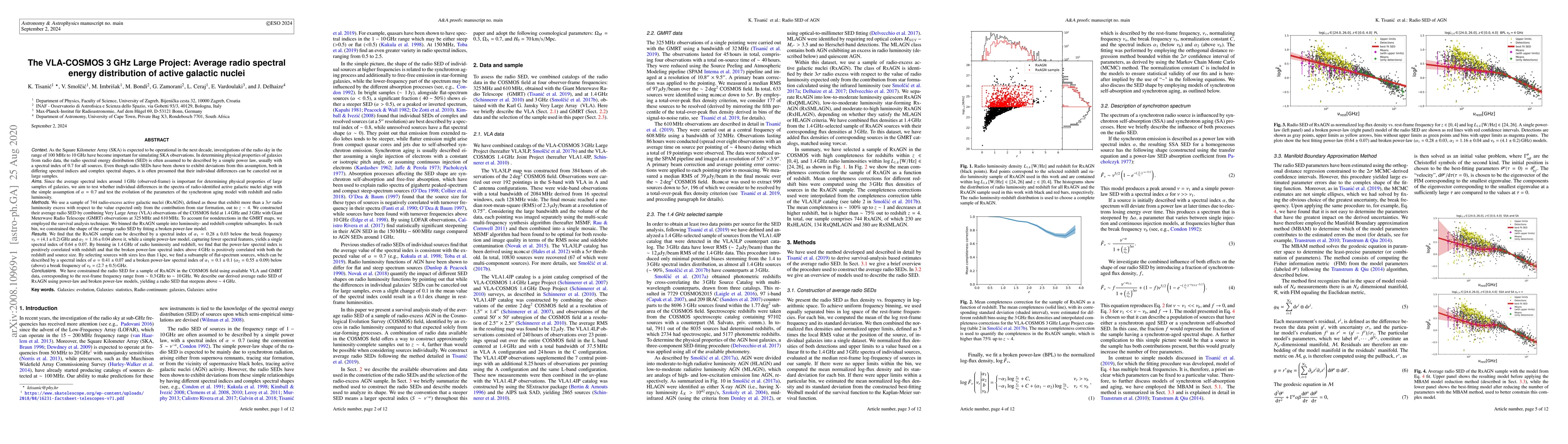 As the SKA is expected to be operational in the next decade, investigations of the radio sky in the range of 100 MHz to 10 GHz have become important for simulations of the SKA observations. In determining physical properties of galaxies from radio data, the radio SED is often assumed to be described by a simple power law, usually with a spectral index of 0.7 for all sources. Even though radio SEDs have been shown to exhibit deviations from this assumption, both in differing spectral indices and complex spectral shapes, it is often presumed that their individual differences cancel out in large samples. We constructed the average radio SED of radio-excess active galactic nuclei (RxAGN), defined as those that exhibit a 3 $\sigma$ radio luminosity excess with respect to the value expected only from contribution from star formation, out to z~4. We combined VLA observations of the COSMOS field at 1.4 GHz and 3 GHz with GMRT observations at 325 MHz and 610 MHz. To account for nondetections in the GMRT maps, we employed the survival analysis technique. We selected a sample of RxAGN out to z~4. We find that a sample of RxAGN can be described by a spectral index of $\alpha_1=0.28\pm0.03$ below the break frequency $\nu_b=(4.1\pm0.2)$ GHz and $\alpha_2=1.16\pm0.04$ above, while a simple power-law model yields a single spectral index of $\alpha=0.64\pm0.07$. By binning in 1.4 GHz radio luminosity and redshift, we find that the power-law spectral index, as well as broken power-law spectral indices, may increase for larger source sizes, while the power-law spectral index and lower-frequency (<4 GHz) broken power-law spectral index are additionally positively correlated with redshift.