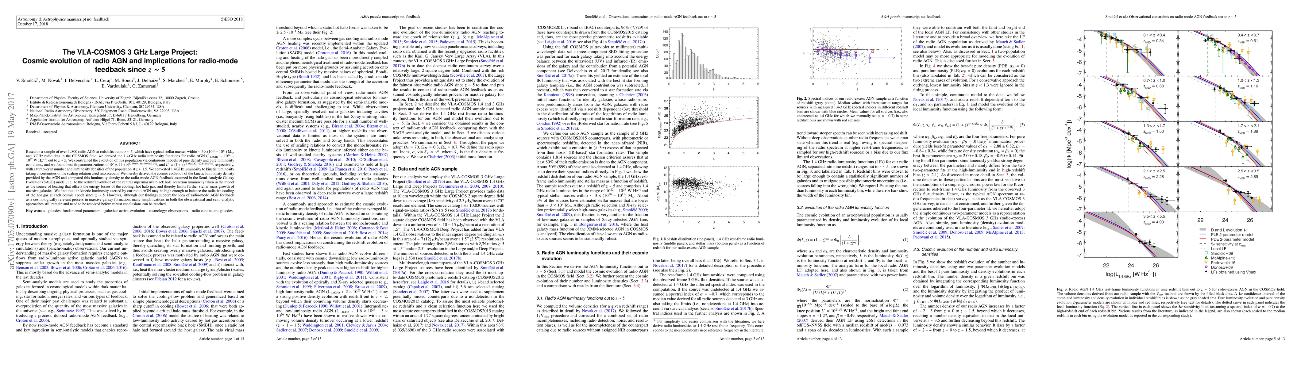 Based on a sample of over 1,800 radio AGN at redshifts out to z~5, which have typical stellar masses within ~3x(10^{10}-10^{11}) Msol, and 3 GHz radio data in the COSMOS field, we derived the 1.4 GHz radio luminosity functions for radio AGN (L_1.4GHz ~ 10^{22}-10^{27} W/Hz) out to z~5. We constrained the evolution of this population via continuous models of pure density and pure luminosity evolutions, and we found best-fit parametrizations of Phi*~(1+z)^{(2.00+/-0.18)-(0.60+/-0.14)z}, and L*~(1+z)^{(2.88+/-0.82)-(0.84+/-0.34)z}, respectively, with a turnover in number and luminosity densities of the population at z~1.5. We converted 1.4 GHz luminosity to kinetic luminosity taking uncertainties of the scaling relation used into account. We thereby derived the cosmic evolution of the kinetic luminosity density provided by the AGN and compared this luminosity density to the radio-mode AGN feedback assumed in the Semi-Analytic Galaxy Evolution (SAGE) model, i.e., to the redshift evolution of the central supermassive black hole accretion luminosity taken in the model as the source of heating that offsets the energy losses of the cooling, hot halo gas, and thereby limits further stellar mass growth of massive galaxies. We find that the kinetic luminosity exerted by our radio AGN may be high enough to balance the radiative cooling of the hot gas at each cosmic epoch since z~5. However, although our findings support the idea of radio-mode AGN feedback as a cosmologically relevant process in massive galaxy formation, many simplifications in both the observational and semi-analytic approaches still remain and need to be resolved before robust conclusions can be reached.