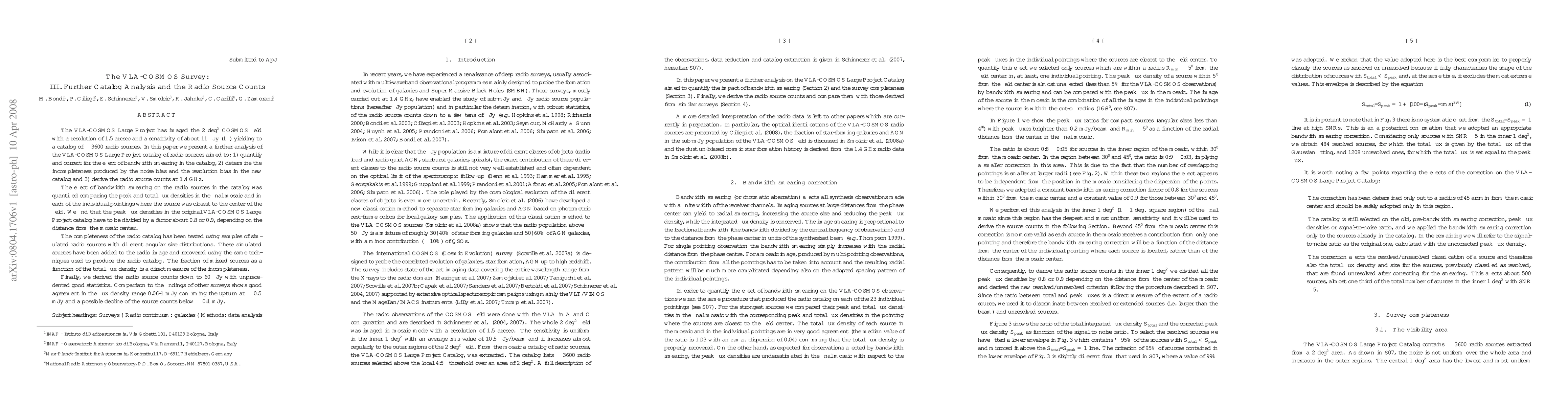 The VLA-COSMOS Survey provides a detailed catalog of 3600 radio sources, correcting for bandwidth smearing and assessing incompleteness due to noise and resolution biases. The study derives radio source counts at 1.4 GHz, confirming an upturn at 0.5 mJy and a potential decline below 0.1 mJy, with good agreement to other surveys.