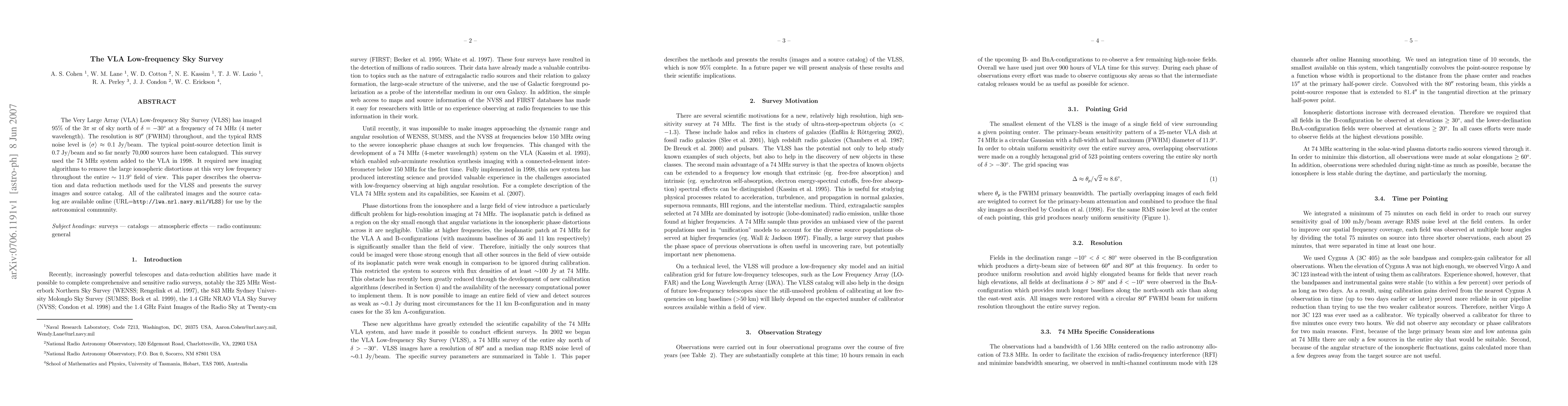 The VLA Low-frequency Sky Survey (VLSS) at 74 MHz has imaged 95% of the sky north of declination -30 degrees, cataloging nearly 70,000 sources with a detection limit of 0.7 Jy/beam. New imaging algorithms were developed to mitigate ionospheric distortions, and the data are available online for astronomical research.