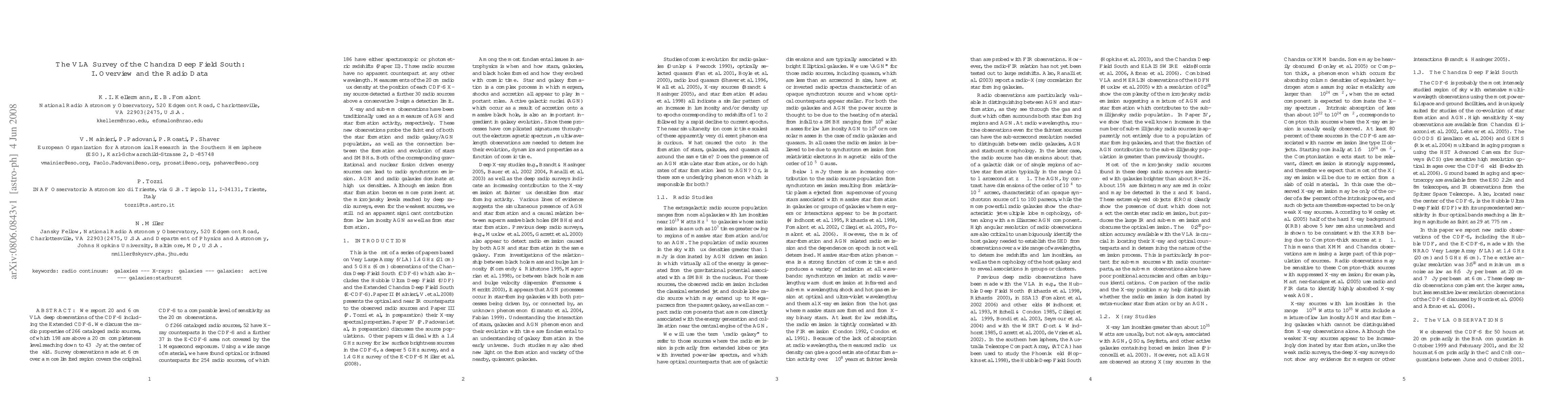 We report 20 and 6 cm VLA deep observations of the CDF-S including the Extended CDF-S. We discuss the radio properties of 266 cataloged radio sources, of which 198 are above a 20 cm completeness level reaching down to 43 microJy at the center of the field. Survey observations made at 6 cm over a more limited region covers the original CDF-S to a comparable level of sensitivity as the 20 cm observations. Of 266 cataloged radio sources, 52 have X-ray counterparts in the CDF-S and a further 37 in the E-CDF-S area not covered by the 1 Megasecond exposure. Using a wide range of material, we have found optical or infrared counterparts for 254 radio sources, of which 186 have either spectroscopic or photometric redshifts (Paper II). Three radio sources have no apparent counterpart at any other wavelength. Measurements of the 20 cm radio flux density at the position of each CDF-S X-ray source detected a further 30 radio sources above a conservative 3-sigma detection limit. X-ray and sub-mm observations have been traditionally used as a measure of AGN and star formation activity, respectively. These new observations probe the faint end of both the star formation and radio galaxy/AGN population, as well as the connection between the formation and evolution of stars and SMBHs. Both of the corresponding gravitational and nuclear fusion driven energy sources can lead to radio synchrotron emission. AGN and radio galaxies dominate at high flux densities. Although emission from star formation becomes more prominent at the microjansky levels reached by deep radio surveys, even for the weakest sources, we still find an apparent significant contribution from low luminosity AGN as well as from star formation.