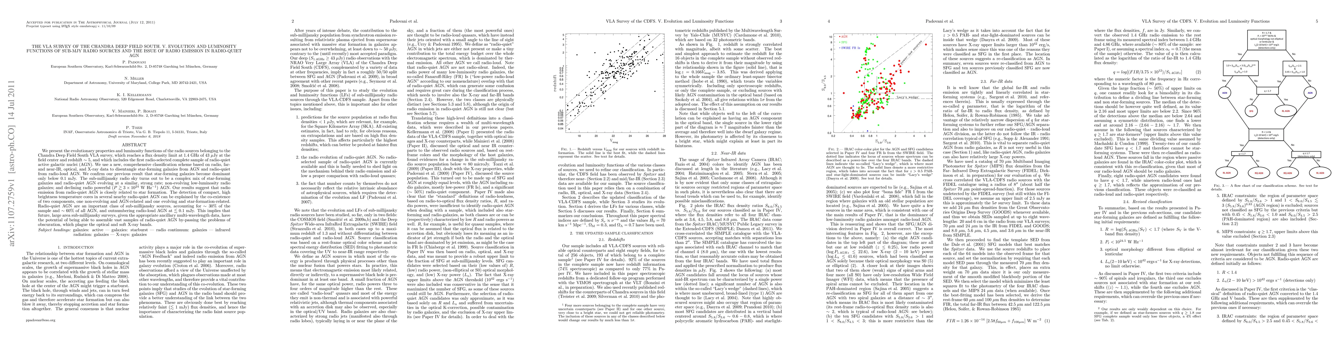 We present the evolutionary properties and luminosity functions of the radio sources belonging to the Chandra Deep Field South VLA survey, which reaches a flux density limit at 1.4 GHz of 43 microJy at the field center and redshift ~5, and which includes the first radio-selected complete sample of radio-quiet active galactic nuclei (AGN). We use a new, comprehensive classification scheme based on radio, far- and near-IR, optical, and X-ray data to disentangle star-forming galaxies from AGN and radio-quiet from radio-loud AGN. We confirm our previous result that star-forming galaxies become dominant only below 0.1 mJy. The sub-mJy radio sky turns out to be a complex mix of star-forming galaxies and radio-quiet AGN evolving at a similar, strong rate; non-evolving low-luminosity radio galaxies; and declining radio powerful (P > 3 10^24 W/Hz) AGN. Our results suggest that radio emission from radio-quiet AGN is closely related to star formation. The detection of compact, high brightness temperature cores in several nearby radio-quiet AGN can be explained by the co-existence of two components, one non-evolving and AGN-related and one evolving and star-formation-related. Radio-quiet AGN are an important class of sub-mJy sources, accounting for ~30% of the sample and ~60% of all AGN, and outnumbering radio-loud AGN at < 0.1 mJy. This implies that future, large area sub-mJy surveys, given the appropriate ancillary multi-wavelength data, have the potential of being able to assemble vast samples of radio-quiet AGN by-passing the problems of obscuration, which plague the optical and soft X-ray bands.