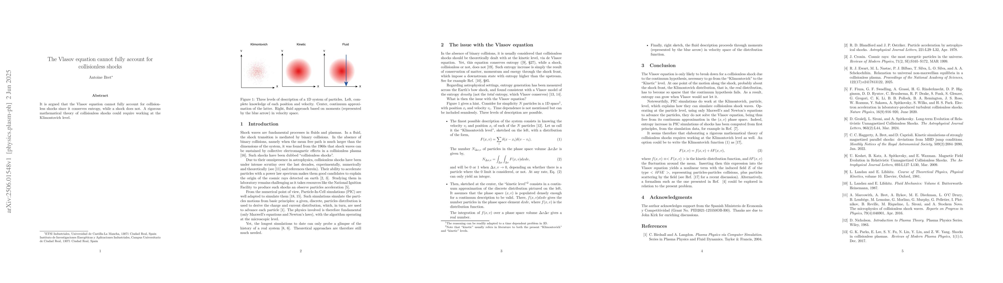 The paper argues that the Vlasov equation, which conserves entropy, fails to accurately describe collisionless shocks. It suggests that a comprehensive theory of these shocks might necessitate the Klimontovich level approach.