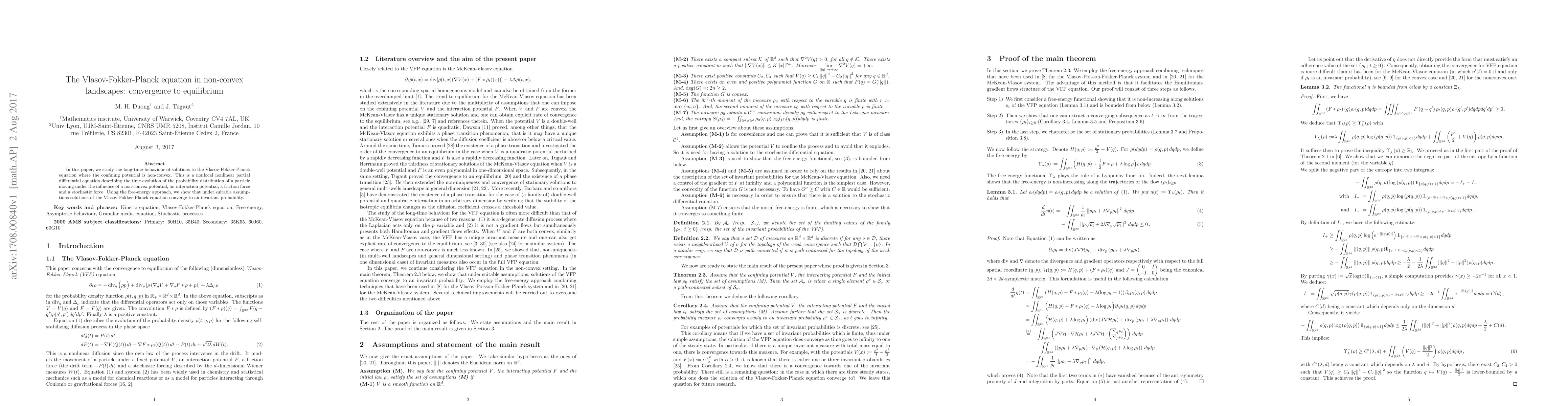 In this paper, we study the long-time behaviour of solutions to the Vlasov-Fokker-Planck equation where the confining potential is non-convex. This is a nonlocal nonlinear partial differential equation describing the time evolution of the probability distribution of a particle moving under the influence of a non-convex potential, an interaction potential, a friction force and a stochastic force. Using the free-energy approach, we show that under suitable assumptions solutions of the Vlasov-Fokker-Planck equation converge to an invariant probability.