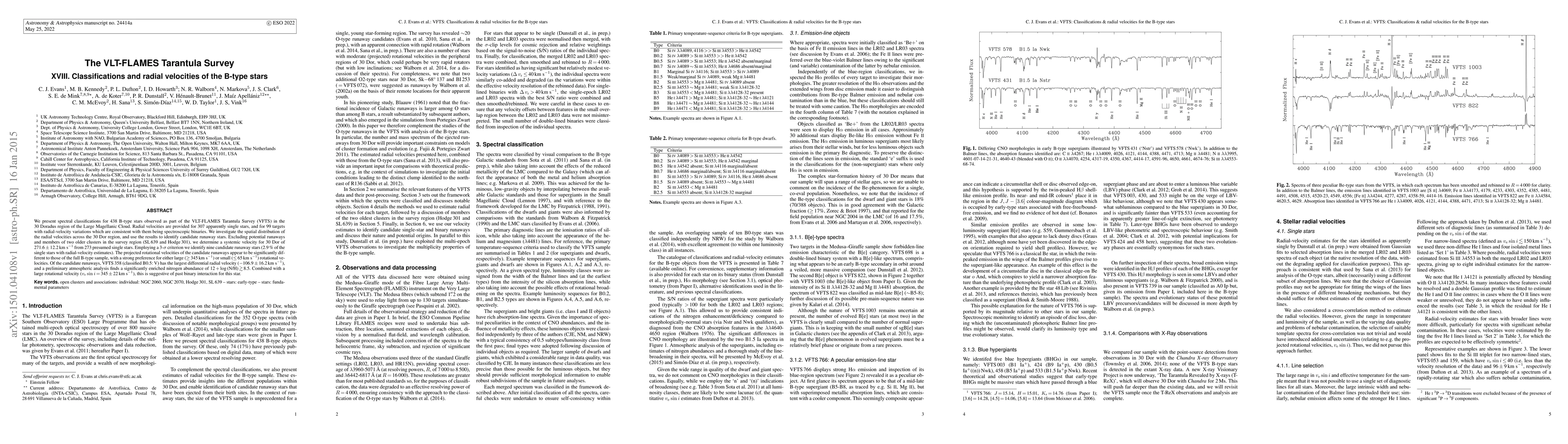 This paper classifies 438 B-type stars in the 30 Doradus region of the Large Magellanic Cloud and provides radial velocities for 307 single stars and 99 spectroscopic binaries. It identifies nine candidate runaway stars, showing distinct rotational velocities and suggesting past binary interactions.