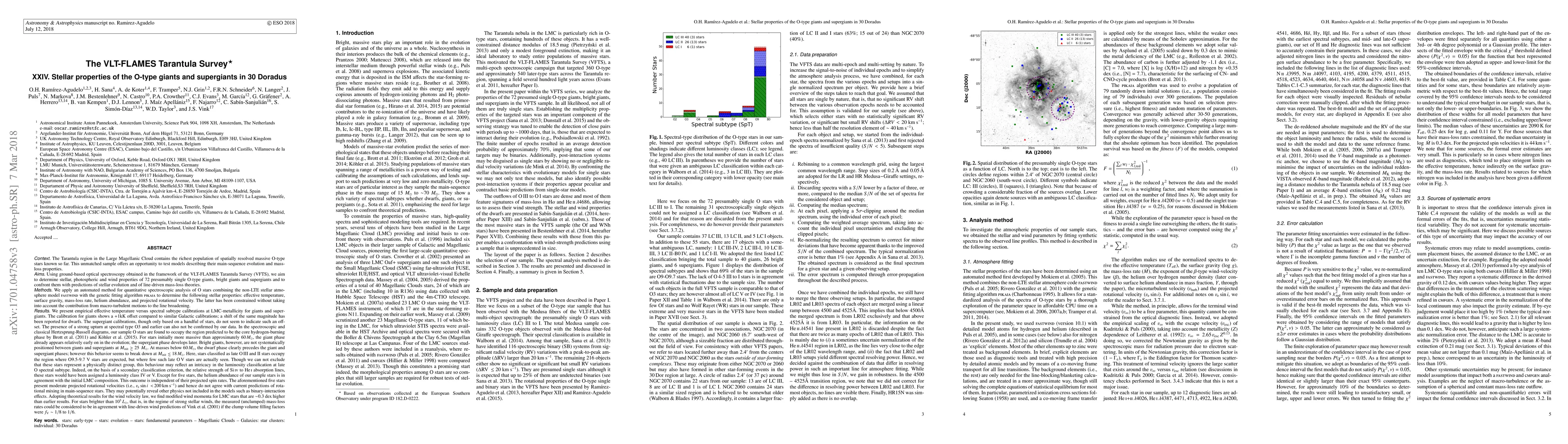 This study analyzes 72 O-type giants and supergiants in 30 Doradus using VLT-FLAMES spectroscopy, determining their effective temperature, surface gravity, mass-loss rate, helium abundance, and rotational velocity. The findings align with current stellar evolution models, except for five stars with higher rotational velocities that challenge existing rotational mixing predictions.