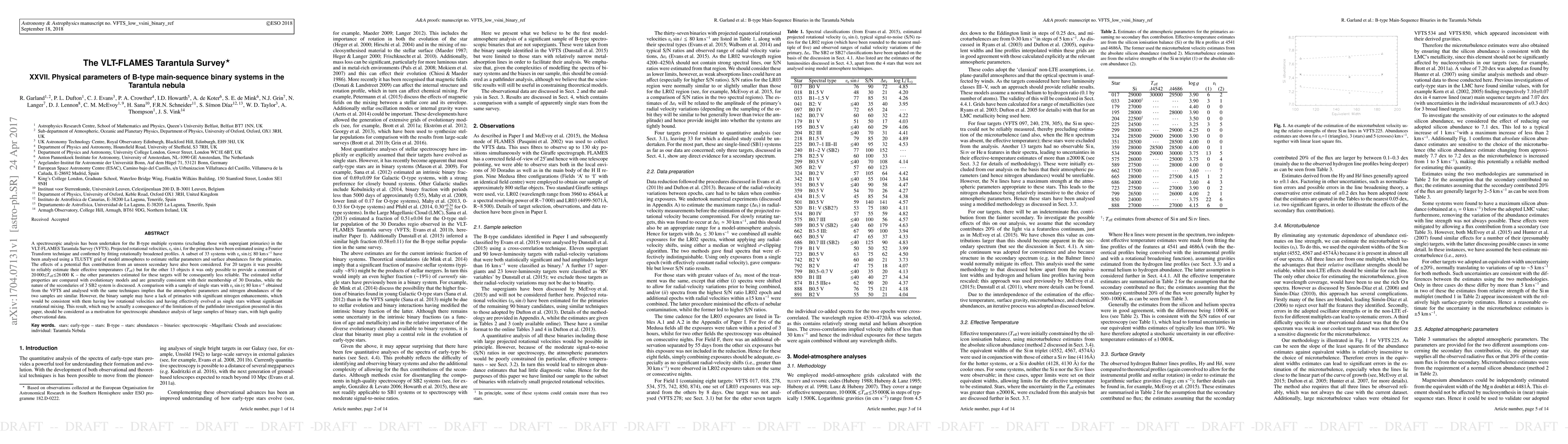 This paper presents spectroscopic analysis of B-type binary systems in the Tarantula nebula, estimating rotational velocities and stellar parameters using model atmospheres. The study finds that binary systems' atmospheric parameters and nitrogen abundances are similar to single stars, suggesting binaries may have evolved similarly to single stars with low rotational velocities.