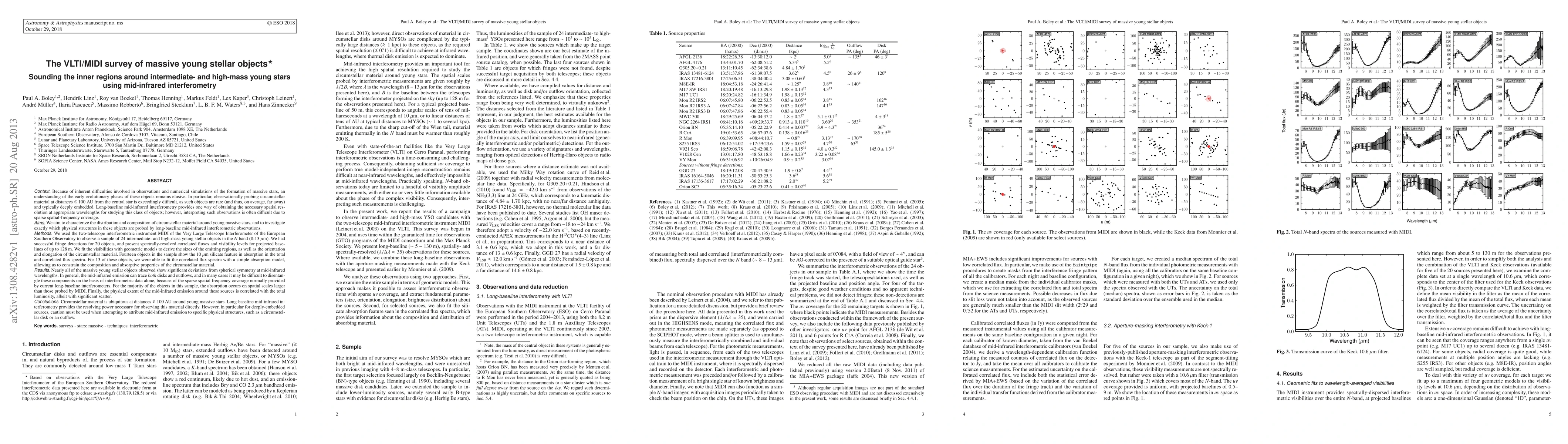 This study uses MIDI interferometry to analyze circumstellar material around 24 massive young stars, revealing significant deviations from spherical symmetry and complex structures like disks and outflows. The findings suggest that mid-infrared emission often correlates with total luminosity but is difficult to fully disentangle in terms of its components due to current interferometric limitations.