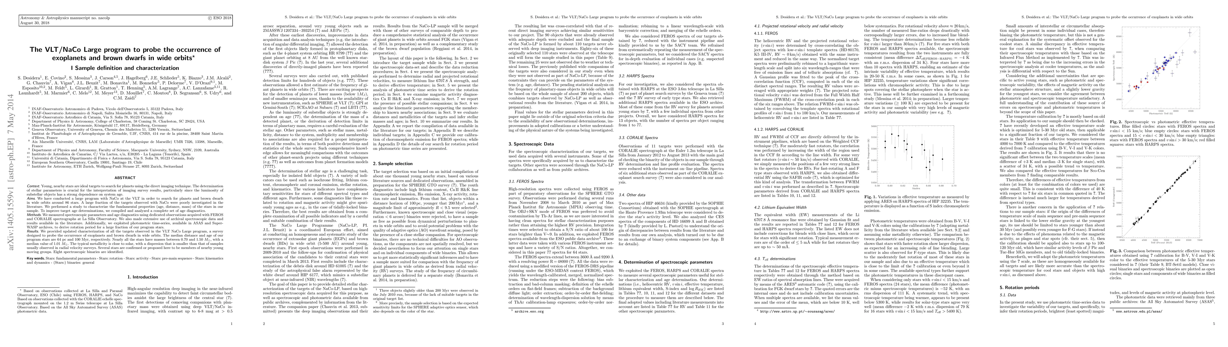 Young, nearby stars are ideal targets to search for planets using the direct imaging technique. The determination of stellar parameters is crucial for the interpretation of imaging survey results particularly since the luminosity of substellar objects has a strong dependence on system age. We have conducted a large program with NaCo at the VLT in order to search for planets and brown dwarfs in wide orbits around 86 stars. A large fraction of the targets observed with NaCo were poorly investigated in the literature. We performed a study to characterize the fundamental properties (age, distance, mass) of the stars in our sample. To improve target age determinations, we compiled and analyzed a complete set of age diagnostics. We measured spectroscopic parameters and age diagnostics using dedicated observations acquired with FEROS and CORALIE spectrographs at La Silla Observatory. We also made extensive use of archival spectroscopic data and results available in the literature. Additionally, we exploited photometric time-series, available in ASAS and Super-WASP archives, to derive rotation period for a large fraction of our program stars. We provided updated characterization of all the targets observed in the VLT NaCo Large program, a survey designed to probe the occurrence of exoplanets and brown dwarfs in wide orbits. The median distance and age of our program stars are 64 pc and 100 Myr, respectively. Nearly all the stars have masses between 0.70 and 1.50sun, with a median value of 1.01 Msun. The typical metallicity is close to solar, with a dispersion that is smaller than that of samples usually observed in radial velocity surveys. Several stars are confirmed or proposed here to be members of nearby young moving groups. Eight spectroscopic binaries are identified.
