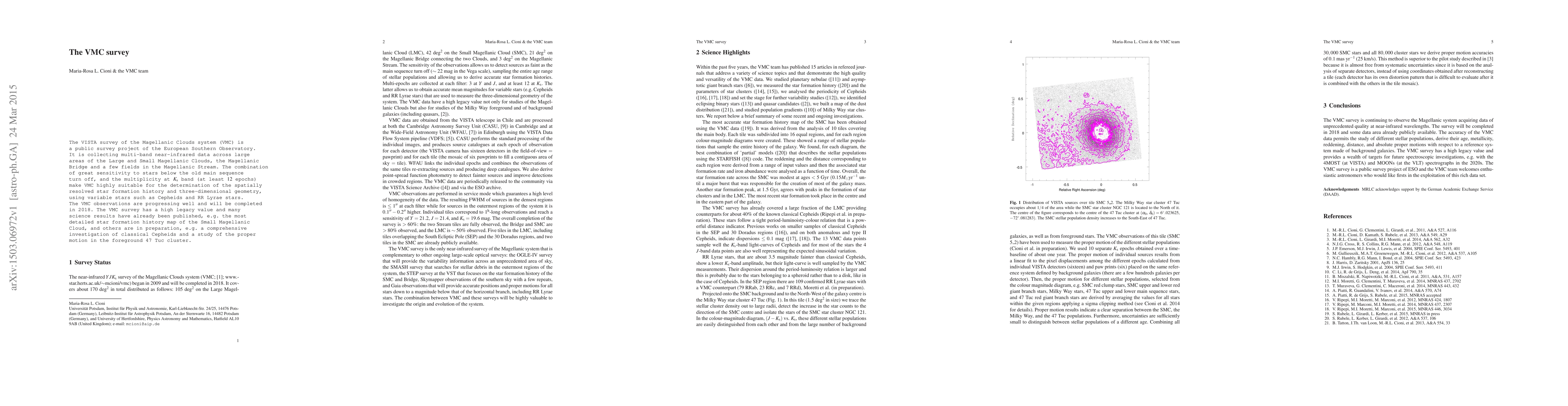 The VISTA survey of the Magellanic Clouds system (VMC) is a public survey project of the European Southern Observatory. It is collecting multi-band near-infrared data across large areas of the Large and Small Magellanic Clouds, the Magellanic Bridge and a few fields in the Magellanic Stream. The combination of great sensitivity to stars below the old main sequence turn off, and the multiplicity at Ks band (at least 12 epochs) make VMC highly suitable for the determination of the spatially resolved star formation history and three-dimensional geometry, using variable stars such as Cepheids and RR Lyrae stars. The VMC observations are progressing well and will be completed in 2018. The VMC survey has a high legacy value and many science results have already been published, e.g. the most detailed star formation history map of the Small Magellanic Cloud, and others are in preparation, e.g. a comprehensive investigation of classical Cepheids and a study of the proper motion in the foreground 47 Tuc cluster.