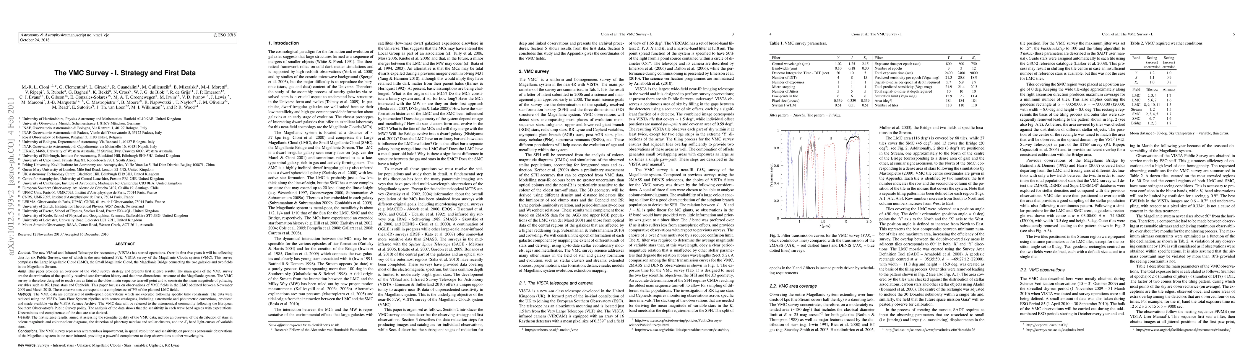 The VMC Survey utilizes the VISTA telescope to conduct a near-infrared YJKsVISTA survey of the Magellanic Clouds system, including the LMC, SMC, Bridge, and Stream. The survey aims to reach faint stars and constrain the mean magnitude of variable stars like RR Lyrae and Cepheids.