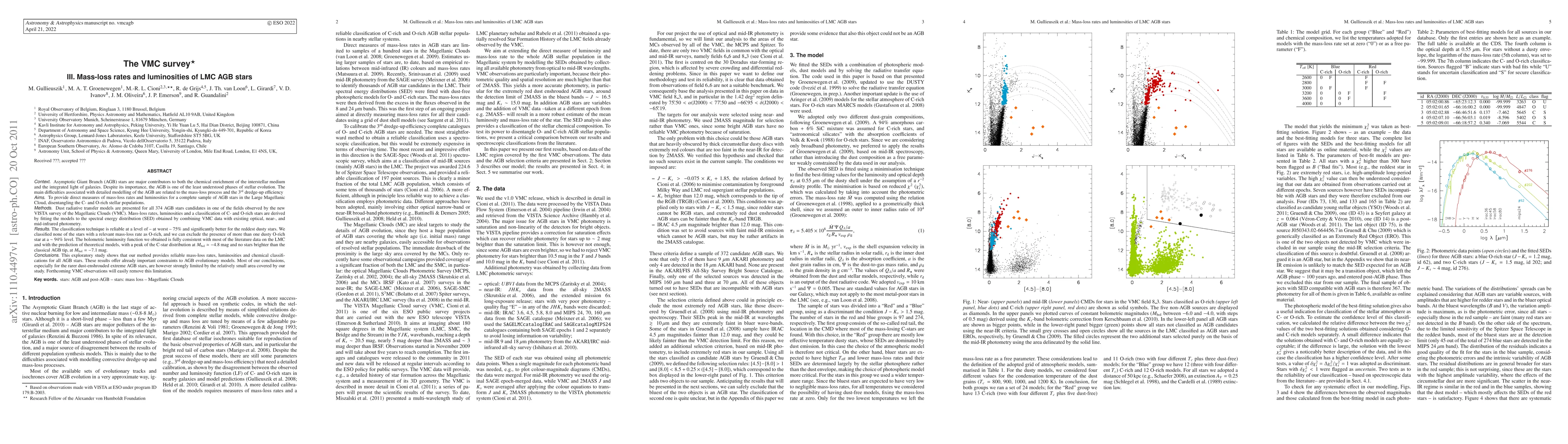 This study presents dust radiative transfer models for 374 AGB stars in the Large Magellanic Cloud, deriving mass-loss rates, luminosities, and chemical classifications. The method provides reliable results, offering important constraints to AGB evolutionary models, though conclusions are limited by the study's small area, which will be addressed by future VMC observations.