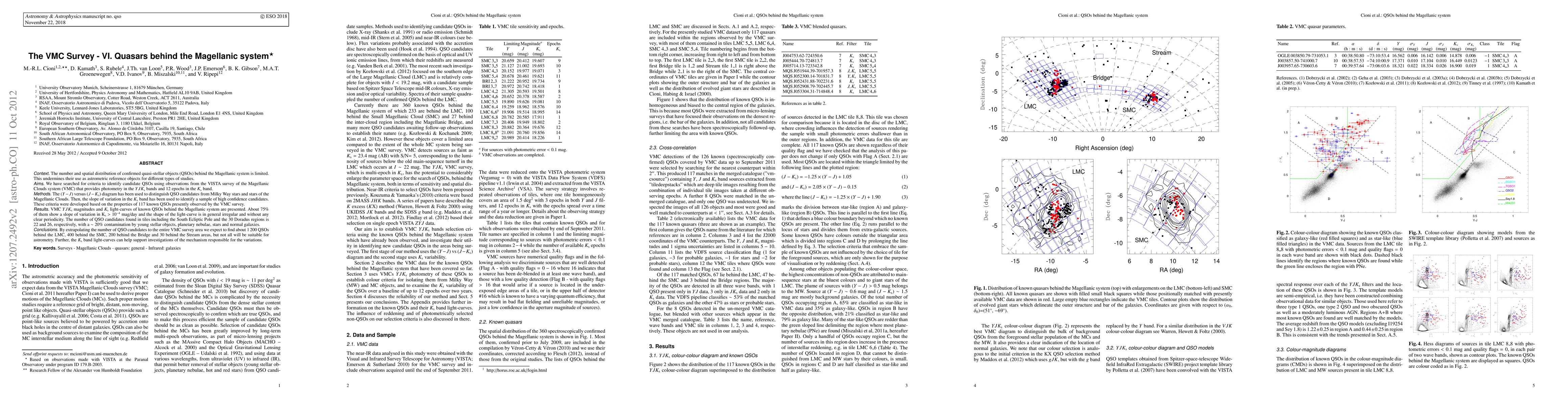 This paper identifies quasar candidates behind the Magellanic system using the VMC survey data, distinguishing them from other objects using the (Y-J) versus (J-Ks) color-color diagram and Ks band light-curve variations. The study estimates the presence of around 1200 QSOs behind the LMC, with many more behind the SMC, but not all suitable for astrometric studies.