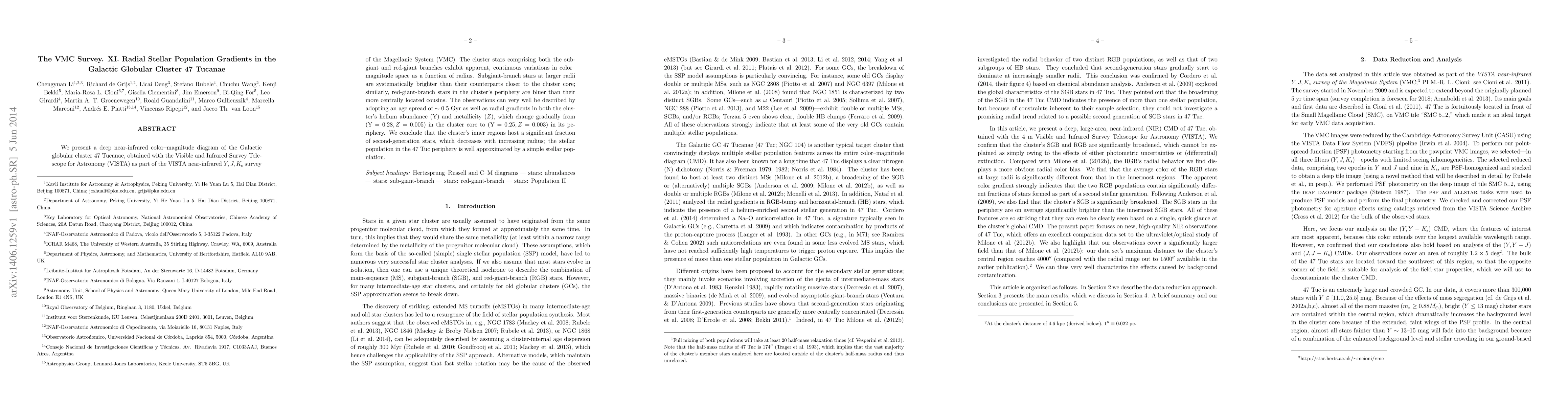 The VMC Survey reveals radial stellar population gradients in the globular cluster 47 Tucanae, showing that stars in the subgiant and red-giant branches exhibit color-magnitude variations with radius. The study attributes these variations to age spread and radial gradients in helium and metallicity, indicating a higher proportion of second-generation stars in the cluster core.