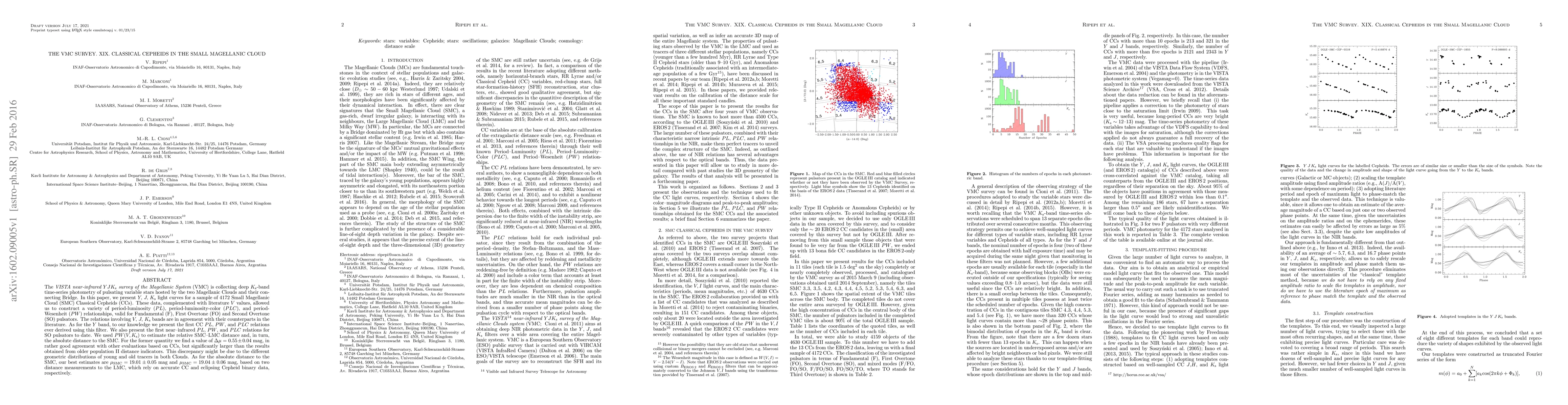 This paper presents Y, J, Ks light curves for 4172 Small Magellanic Cloud Classical Cepheids from the VMC survey, constructing period-luminosity relationships for different pulsators. It estimates the relative SMC-LMC distance and provides new absolute distance estimates for SMC, finding a discrepancy with older distance indicators likely due to different tracer distributions.
