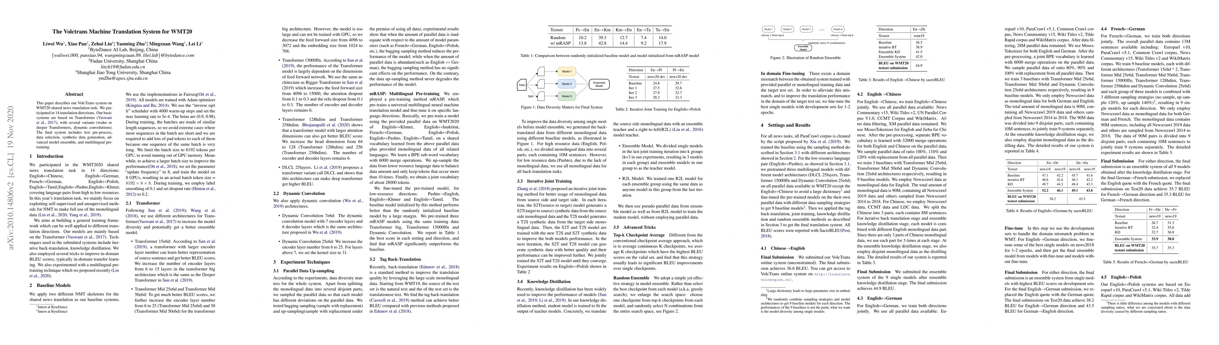 VolcTrans is a Transformer-based machine translation system developed for the WMT20 shared news translation task, employing various enhancements like wider/deeper architectures, dynamic convolutions, and advanced ensemble techniques, along with pre-processing and synthetic data generation. The system achieved competitive results in 8 translation directions.