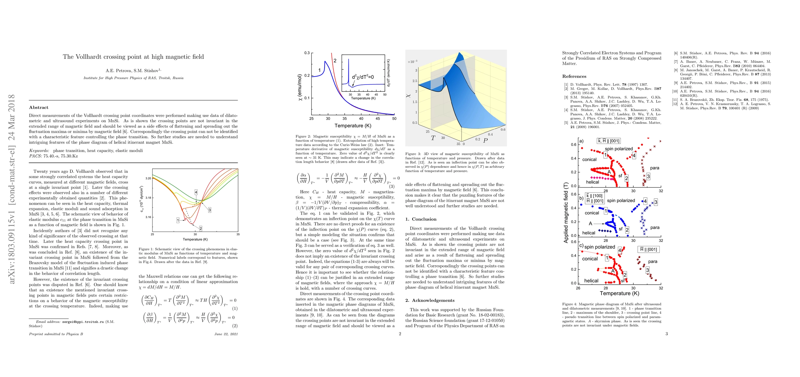 Direct measurements of the Vollhardt crossing point coordinates were performed making use data of dilatometric and ultrasound experiments on MnSi. As is shown the crossing points are not invariant in the extended range of magnetic field and should be viewed as a side effects of flattening and spreading out the fluctuation maxima or minima by magnetic field~\cite{Sti16}. Correspondingly the crossing point can not be identified with a characteristic feature controlling the phase transition. So further studies are needed to understand intriguing features of the phase diagram of helical itinerant magnet MnSi.